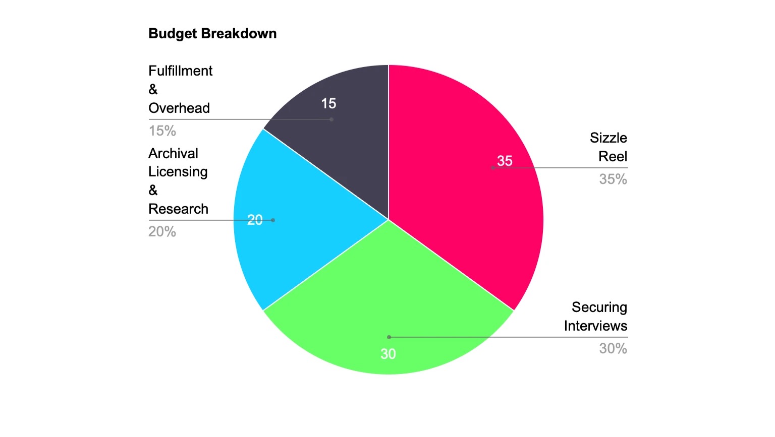 15% - Fulfillment & Overhead: Initial editing costs, creating strong visual pitch materials, and perk fulfillment (shipping, printing, and covering the necessary payment processing fees).