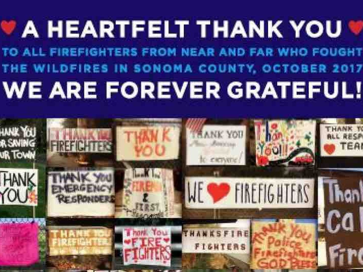 During the devastating firestorm that roared across Sonoma County October 2017, firefighters from near and far came to our rescue. We wish to thank them! And we're not alone. All across Sonoma County residents have put up roadside "thank you" signs.