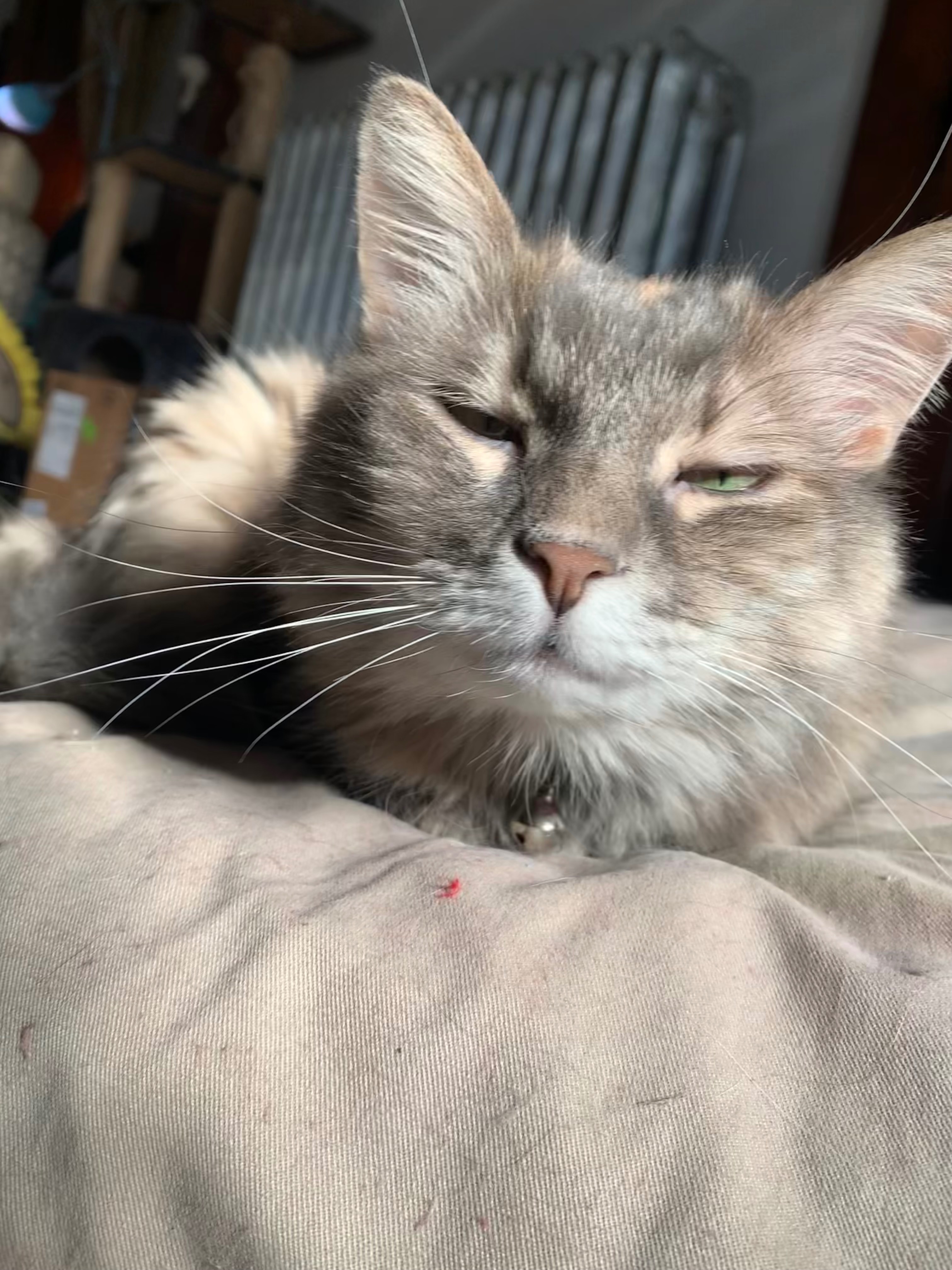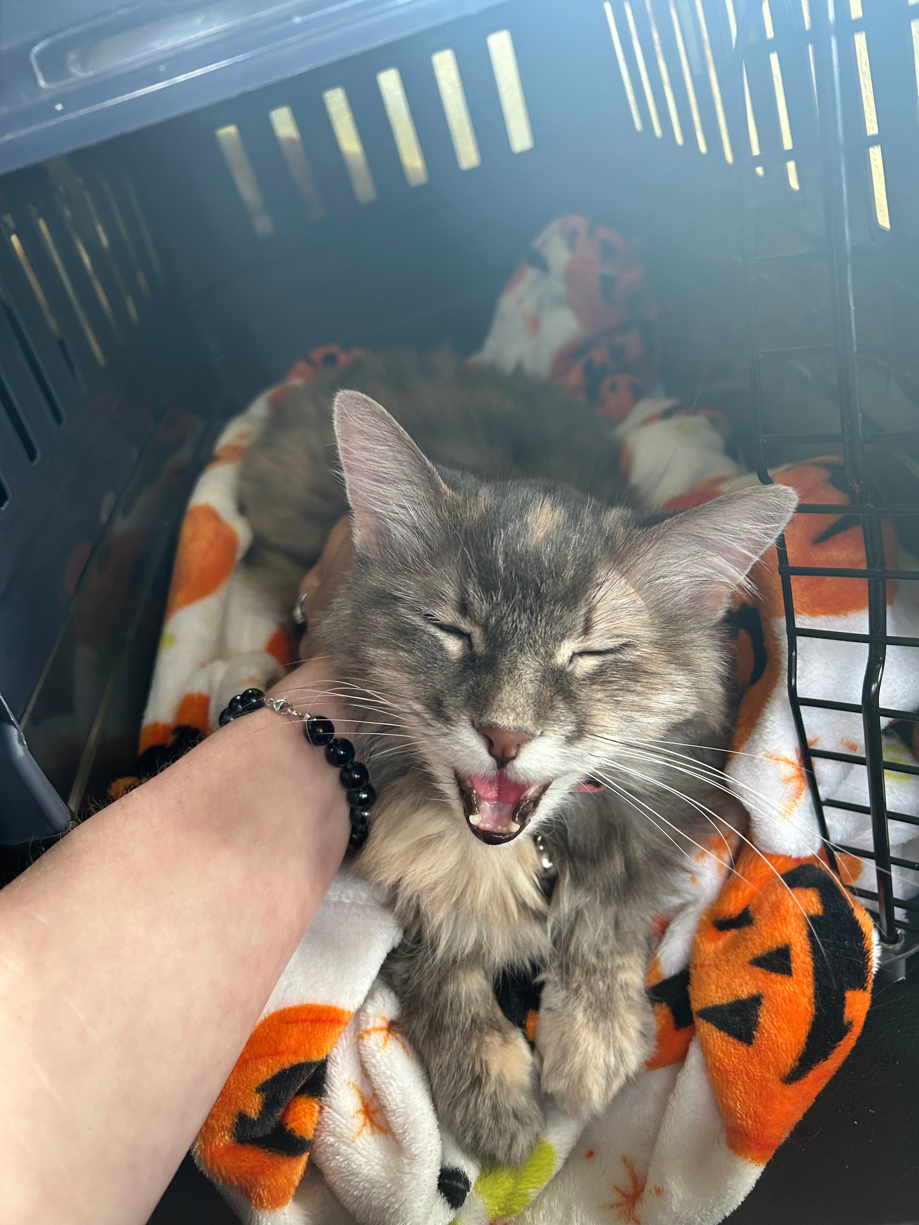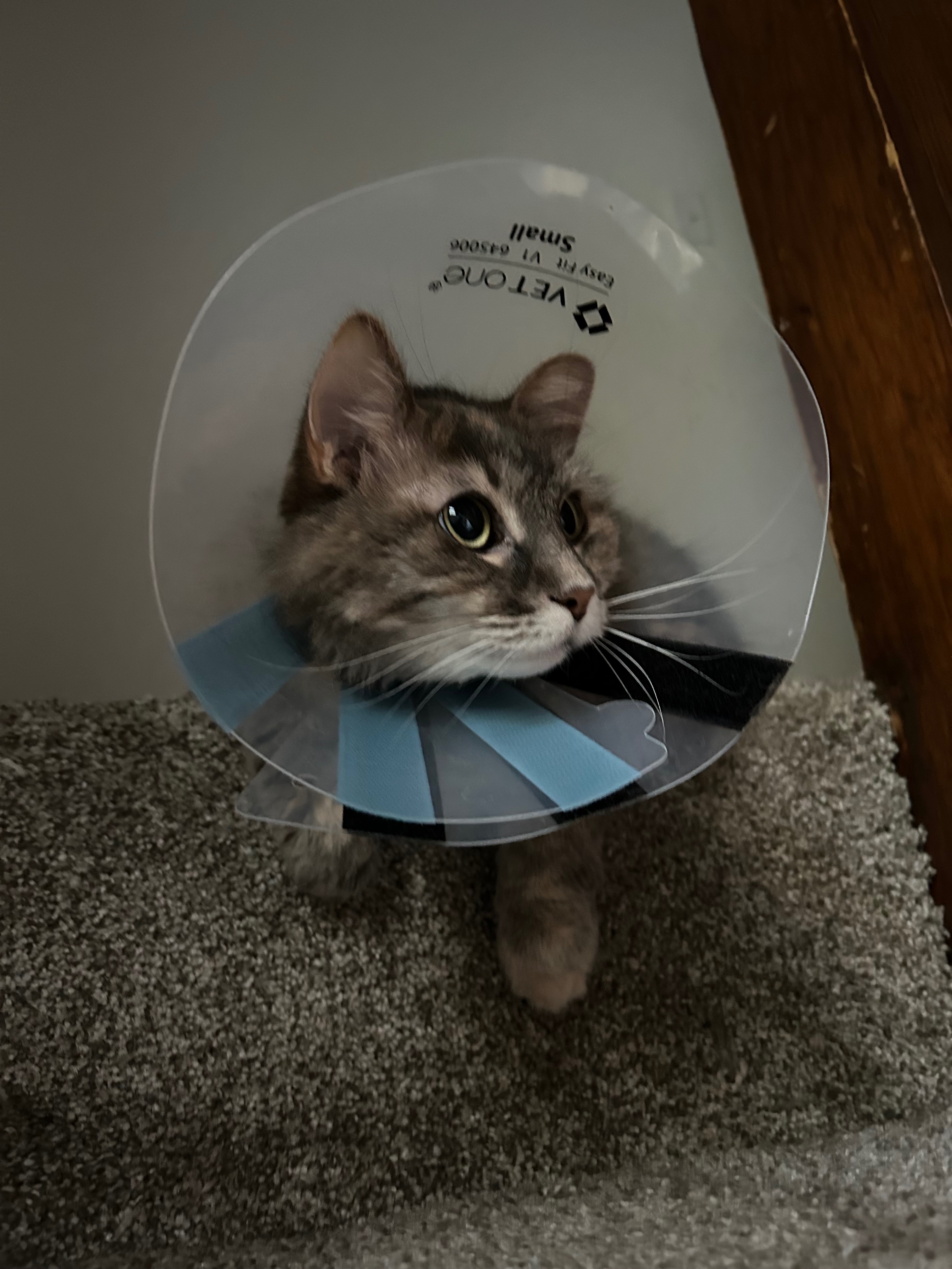 Trigger warning: the tip of her tail got degloved. They wanted to amputate the exposed bone, but won’t sedate her due to her lung condition. Instead, she’s got more meds and a fancy cone. We’ll be crossing our fingers (again) that it heals up and falls off on its own without any more damage to the tissues and nerves of her tail.