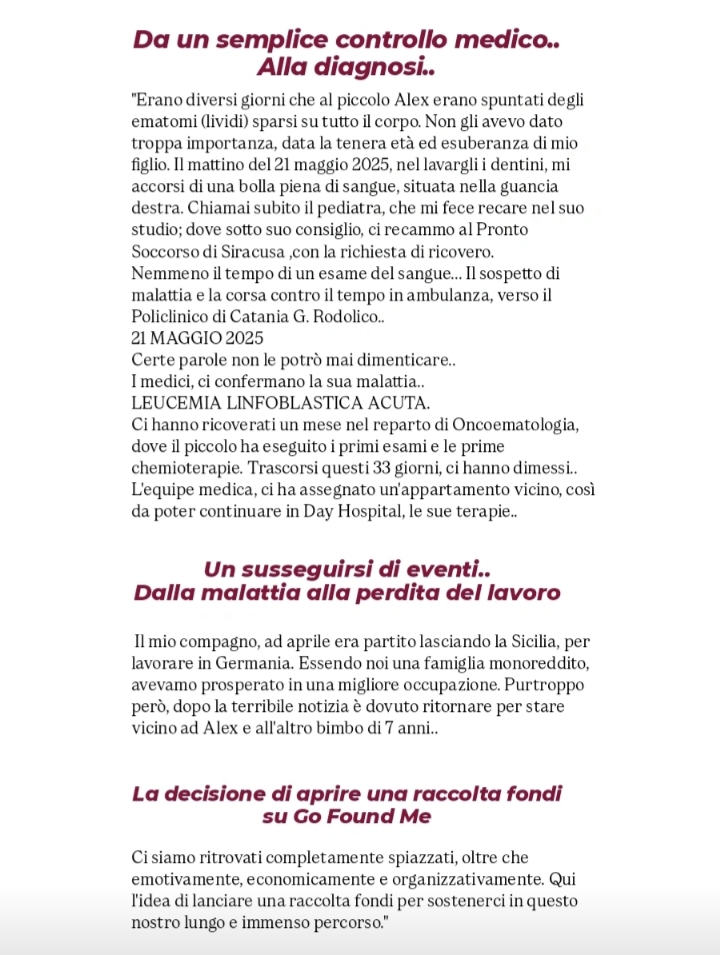 Inoltre, vi preghiamo di condividere questa pagina e di tenere Alex nelle vostre preghiere e nei vostri pensieri. La vostra gentilezza significa più di quanto le parole possano esprimere.