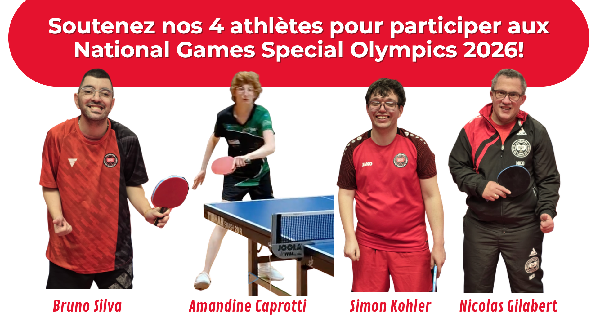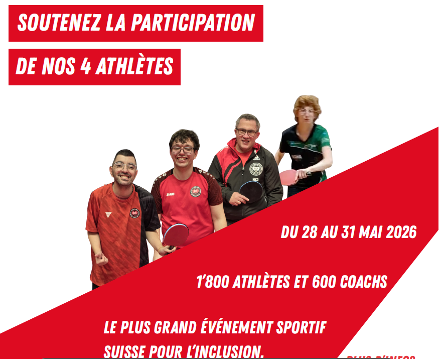 Quatre athlètes de notre club participeront au tournoi de tennis de table des National Summer Games 2026 à Zoug, organisés par Special Olympics Switzerland - organisation sportive qui organise des compétitions pour athlèthes avec déficience intellectuelle. Ces compétitions comprennent les Jeux olympiques spéciaux, qui alternent entre les Jeux d'été et d'hiver.