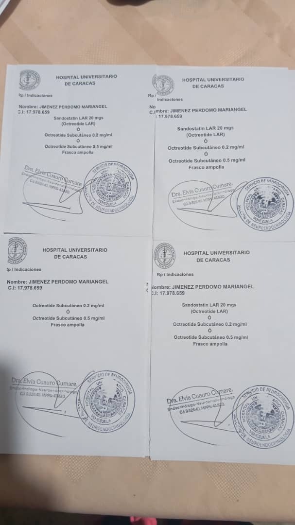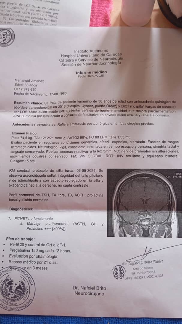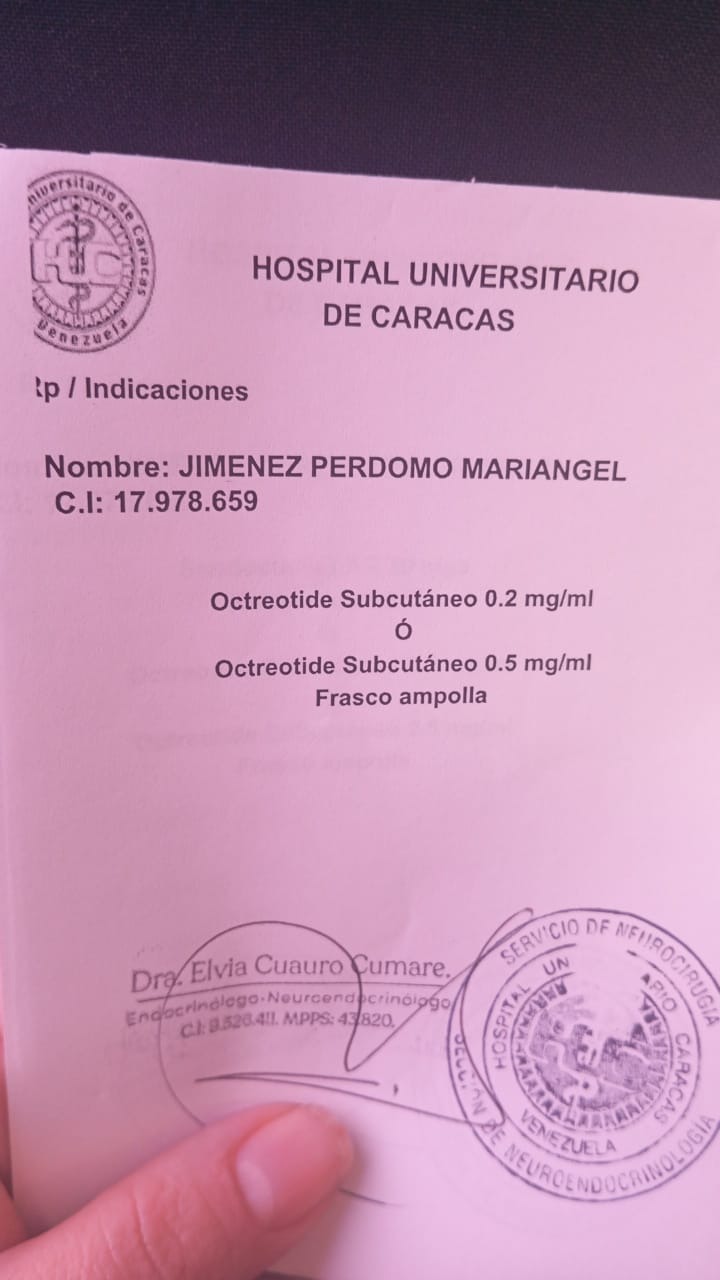 Hola, mi nombre es Mariangel Jiménez tengo 38 años de edad, he pasado por dos procesos quirúrgicos, ya hoy en día fui diagnosticada con ACROMEGALIA. Debo cumplir un tratamiento, de acuerdo a mi diagnóstico, el cual tiene un costo elevado a lo que puedo cubrir, vivo en Venezuela, soy fisioterapeuta, trabajo en la fundación del niño de ciudad bolívar, tuve que viajar hasta Caracas por indicaciones de mi Doctor, tengo una niña pequeña, soy madre soltera, mi tratamiento requiere unas ampollas que no puedo cubrir con mi sueldo actual, por lo cual recurro a este tipo de medios para pedir tu ayuda.