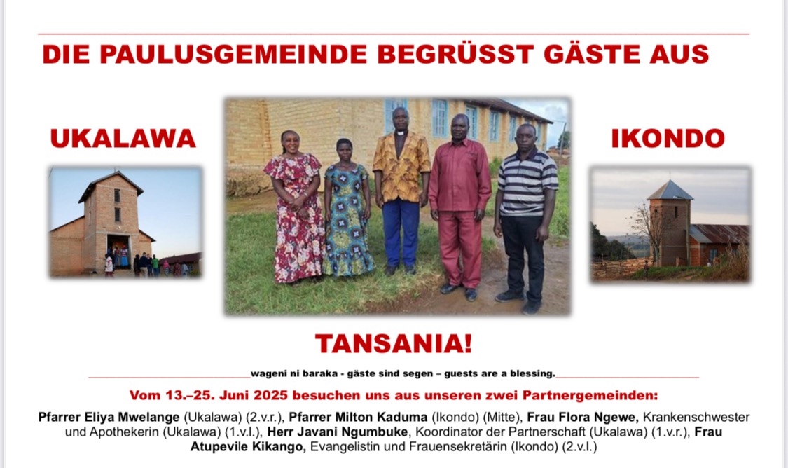 Diese Spendenaktion starte ich, um unseren fünf tansanischen Gästen, die vom 13. Juni bis zum 25. Juni als Delegation ihrer Gemeinden bei uns in der Paulusgemeinde zu Besuch sein werden, einen "Geldsegen" kwa watoto (für die Kinder) mitzugeben. - Einen Geldsegen also, der den Kindern zugute kommen soll, die in den Gemeinden Ukalawa und Ikondo und den dazugehörigen Dörfern im ländlichen Südwesten Tansanias leben und aufwachsen.