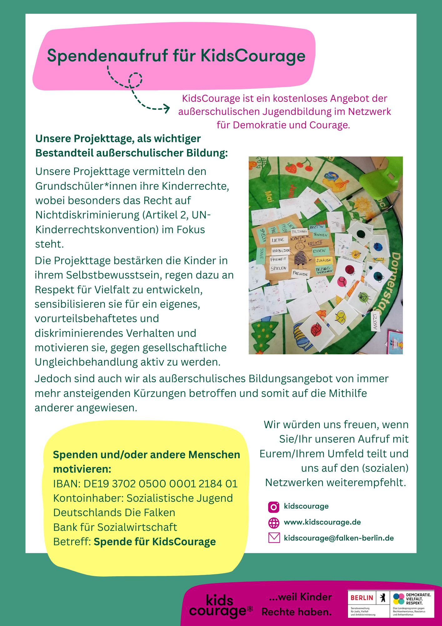 We are KidsCourage—the place to go to for project days about the topic of children's rights for children in Berlin. Today we are reaching out to you with a somewhat more serious topic, because we need your support❗