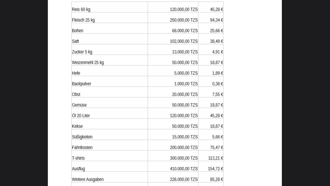 Alle Kosten zusammengerechnet betragen insgesamt um die 2.000.000 TZS. Das sind umgerechnet 754,72€