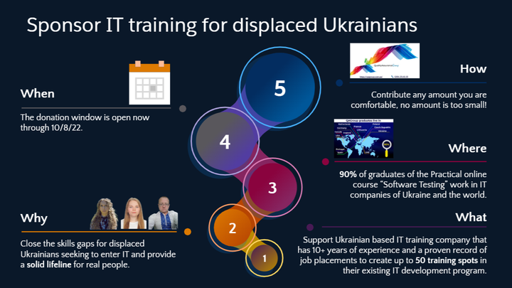 IT is one of the few sectors in Ukraine that is still operating and growing. And since IT is all I know, I invite you to sponsor online IT training for a group of Ukrainians impacted by war.
