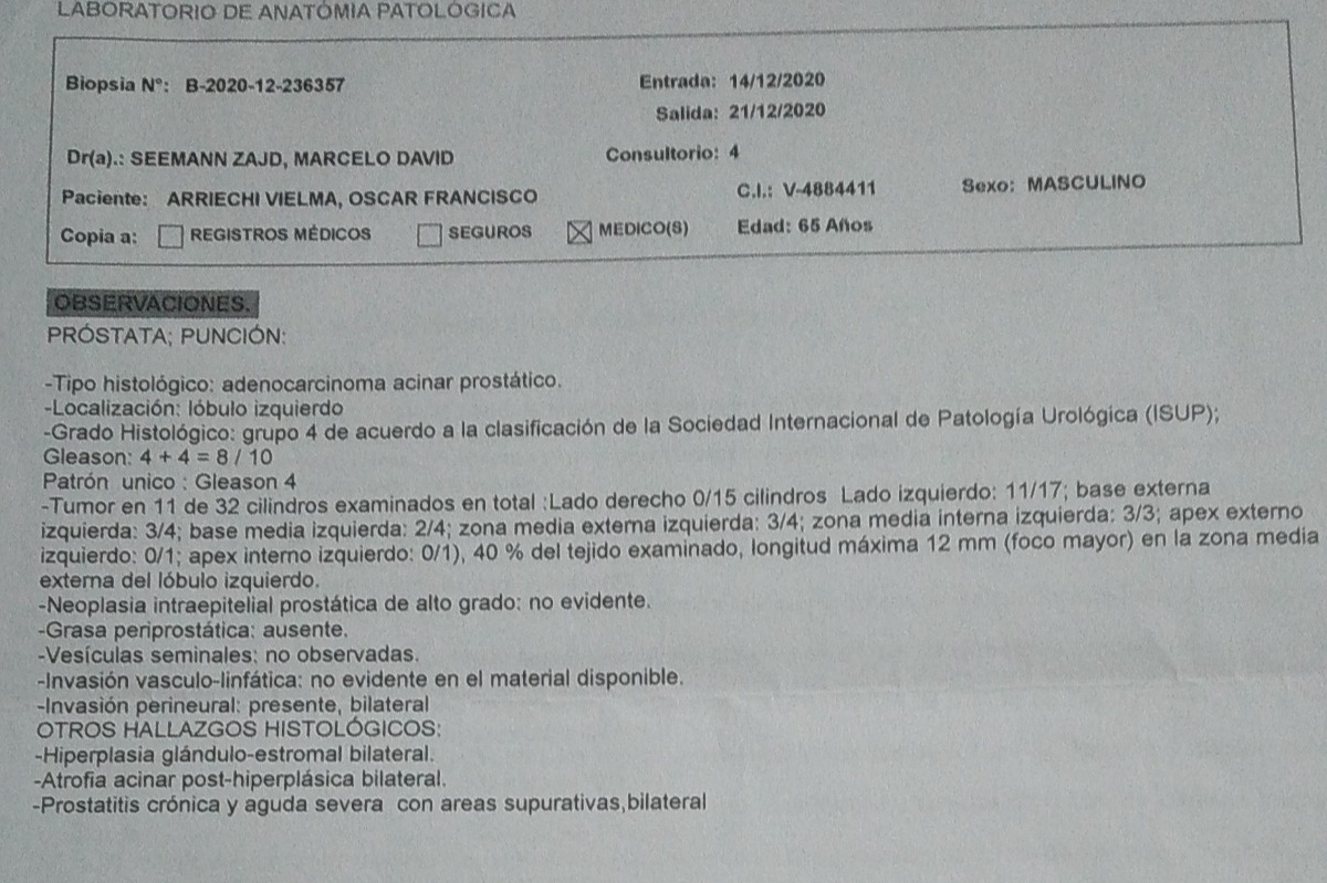 On October 14th of 2020, after presenting several sym, the doctors confirmed the presence of a tumor in my prostate (Acinar Prostatic Adenocarcinoma Group 4).