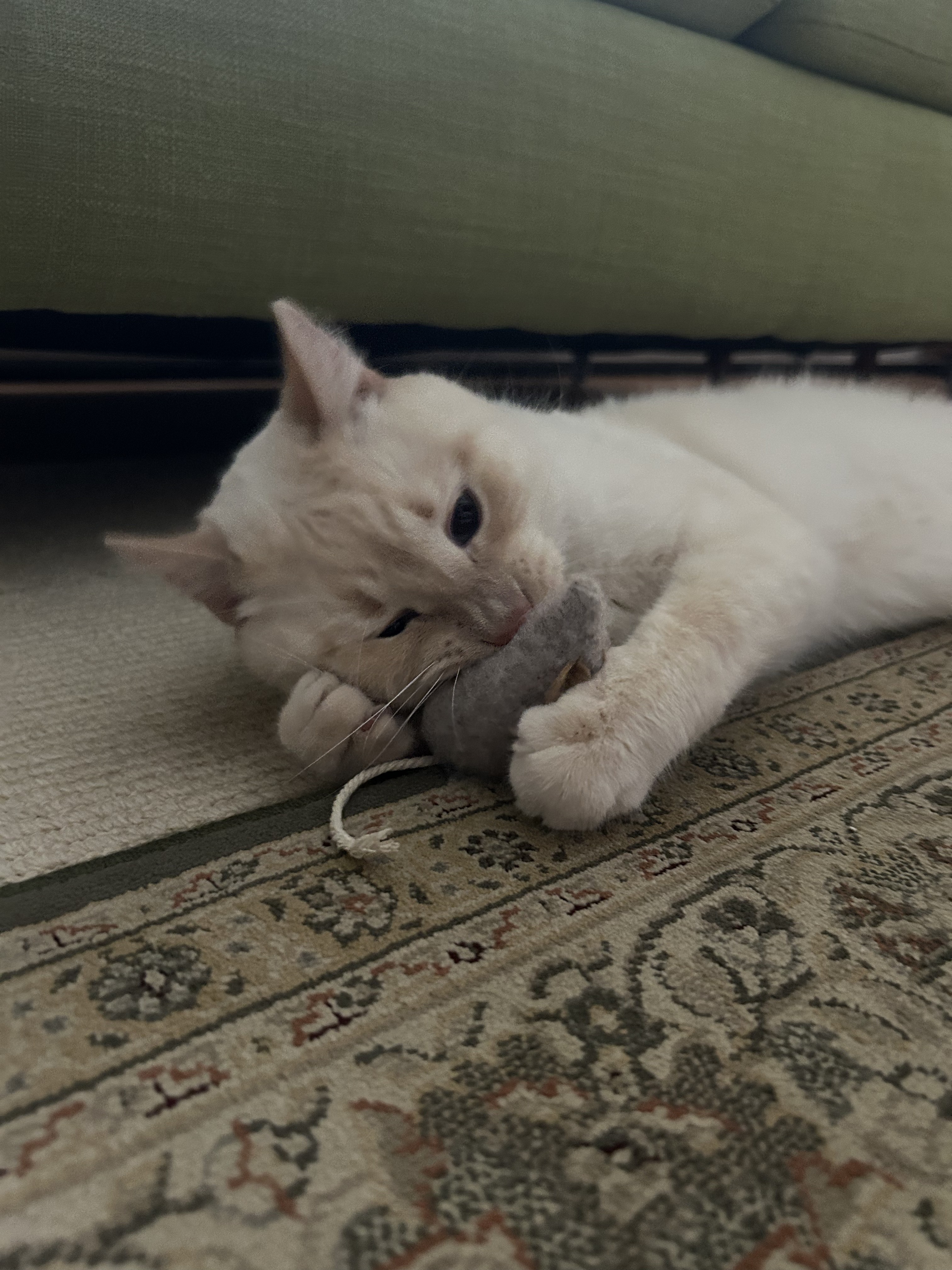 From what we heard from his previous owner, he was being bullied by his cat roommates and was in need of rehoming due to this. When we got Leo he was scared, shy, and had signs of high anxiety. It took a long time for us to reach through to him, but now he’s a very happy and curious cat.