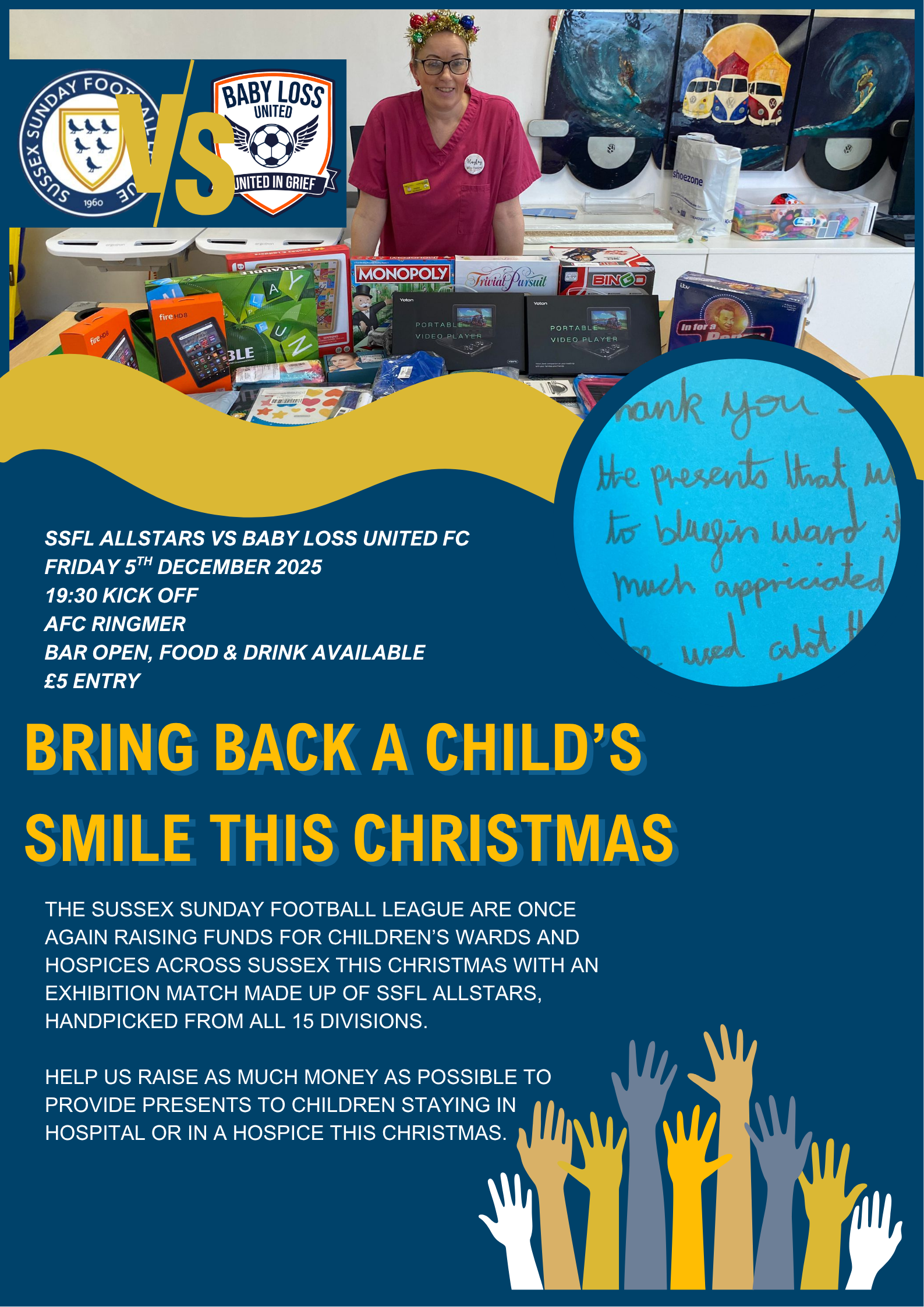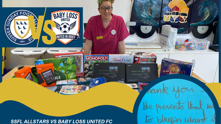 As well as raising money on the night of an exhibition match between SSFL Allstars and Baby Loss United on Friday 5th December 2025 at AFC Ringmer, we are hoping to raise even more money online, through this gofundme page. Every penny and pound matters and will make a massive difference to the children of Sussex spending their Christmas in hospital.
