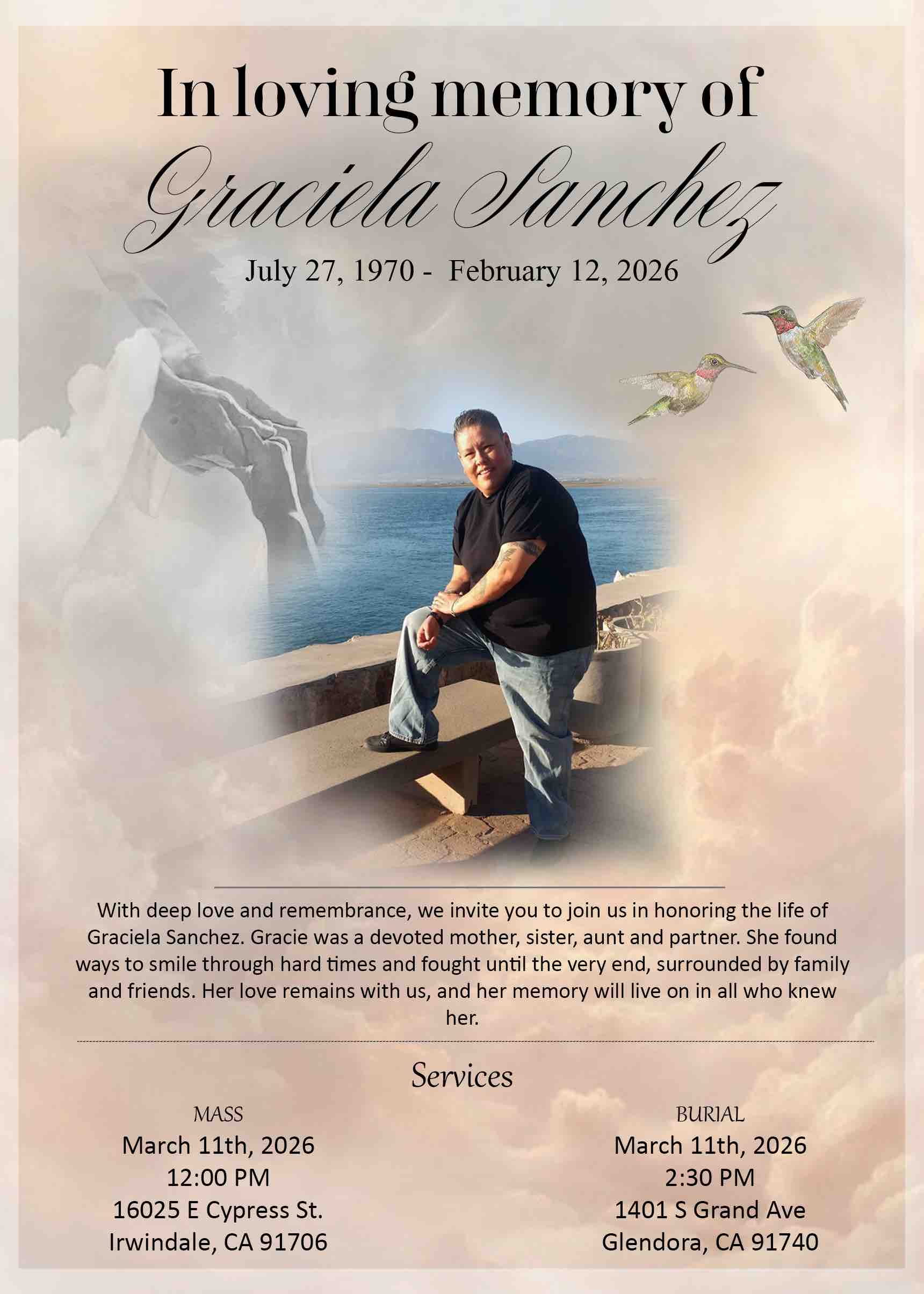 Invitamos a todas las personas que conocieron y quisieron a mi mamá, o cuya vida fue tocada por ella, a acompañarnos para honrar su hermosa vida. Los servicios estarán abiertos para todos los que deseen asistir. Su presencia significaría mucho para nuestra familia mientras nos reunimos para celebrar su amor, su bondad y el impacto tan especial que dejó en cada uno de nosotros.