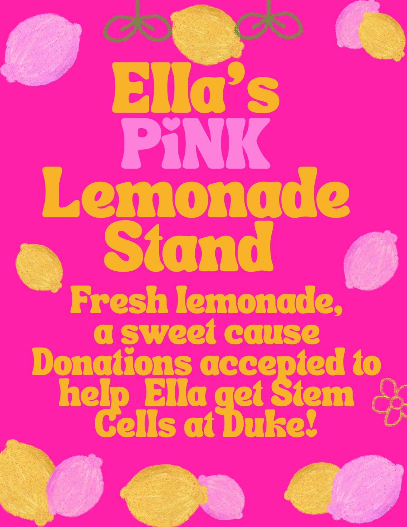 Ella is hosting her very own Pink Lemonade Stand to raise funds for her upcoming stem cell treatment at Duke. Every donation — big or small — helps get her one step closer to this life-changing opportunity.