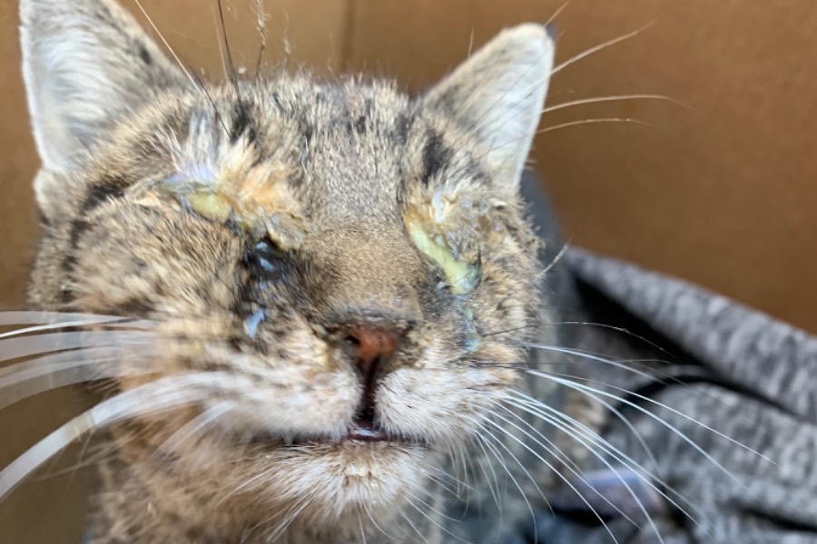 I found this suffering cat lying in a ditch calling out for help. It appears he/she has no eyes, is VERY skinny, and was just waiting to die.