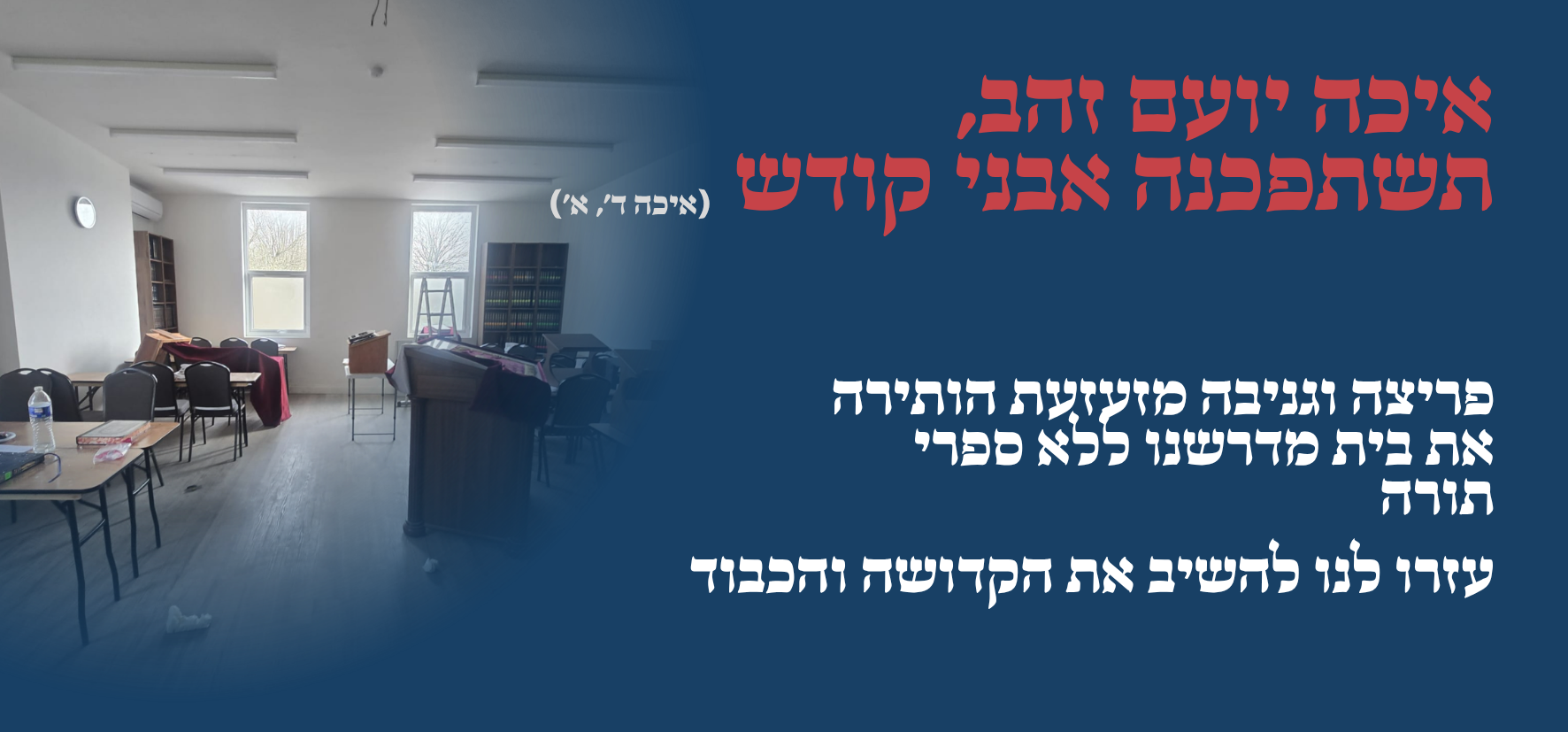 We turn to you—please open your hearts and partner with us in this urgent mission. Every donation is a חלק in bringing back the ספרי תורה and restoring the קדושה of our בית מדרש.