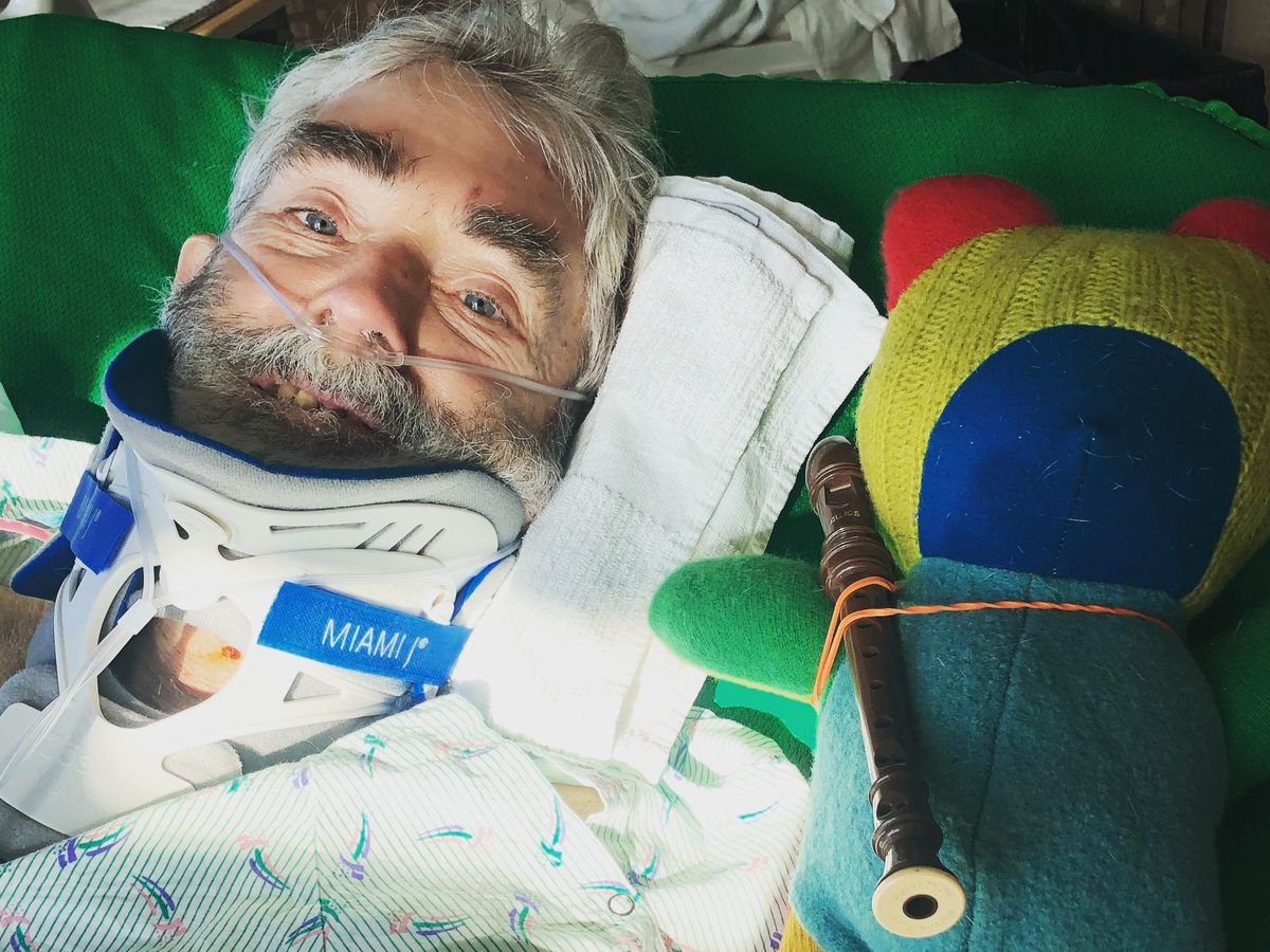 On the evening of 11/21/22, I got a call from my brother who told me that the paramedics were on the way because he had come home to find Stoney in the dark at the bottom of the stairs, his face smashed up against the wall, unable to move, confused, with blood pooling at his head. The paramedics took Stoney to the emergency room at St. Joe's in Bellingham and he was then flown to Harborview in Seattle. We learned that he had fallen down the stairs, broken his neck, and been paralyzed with an incomplete spinal cord injury. At Harborview, he had surgery to fuse cervical vertebrae 2 through 6. The injury and surgery left him nearly completely immobilized, without the ability to swallow, breathe well, and move anything aside from his left leg. He lost forty pounds during his stay at Harborview.