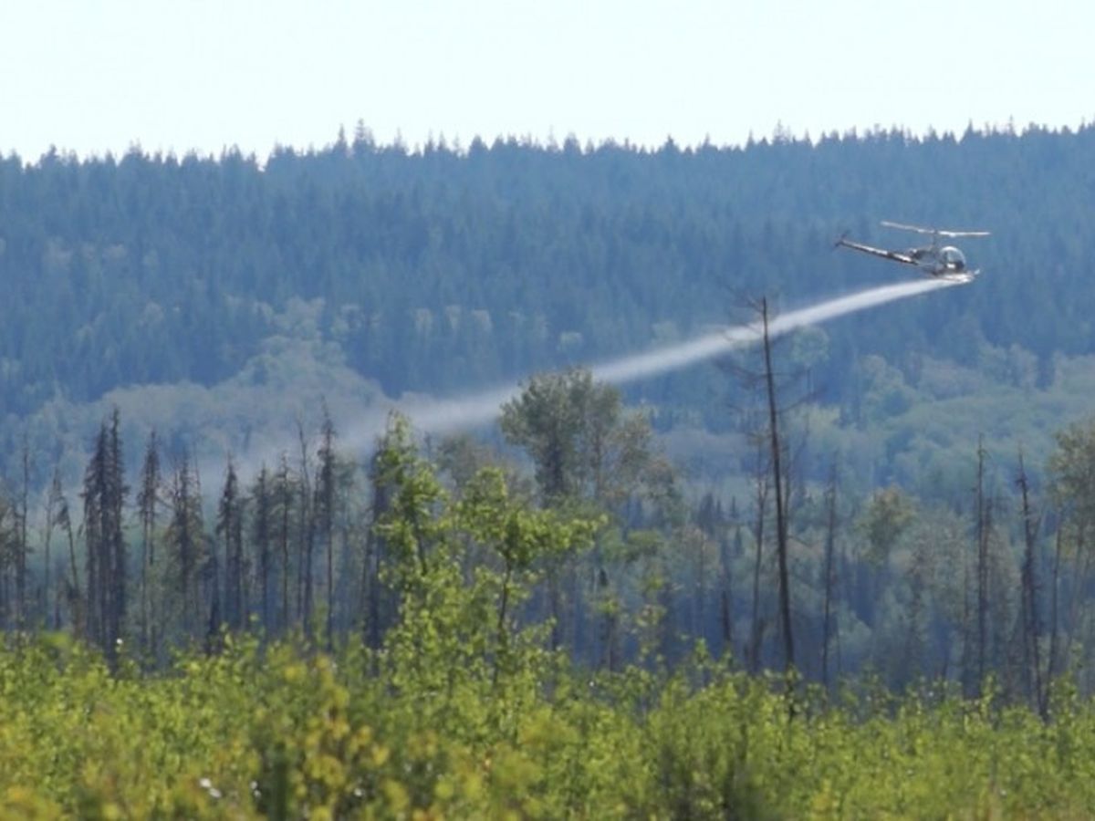 Utilizing helicopters equipped with spray nozzles and tanks of herbicides, companies spray these cutblocks 5-10 years after logging with industrial-strength glyphosate to kill every plant that isn't a conifer. The effects are devastating and long-lasting, as a forest without aspen will support far fewer wildlife, and especially moose, than one with.