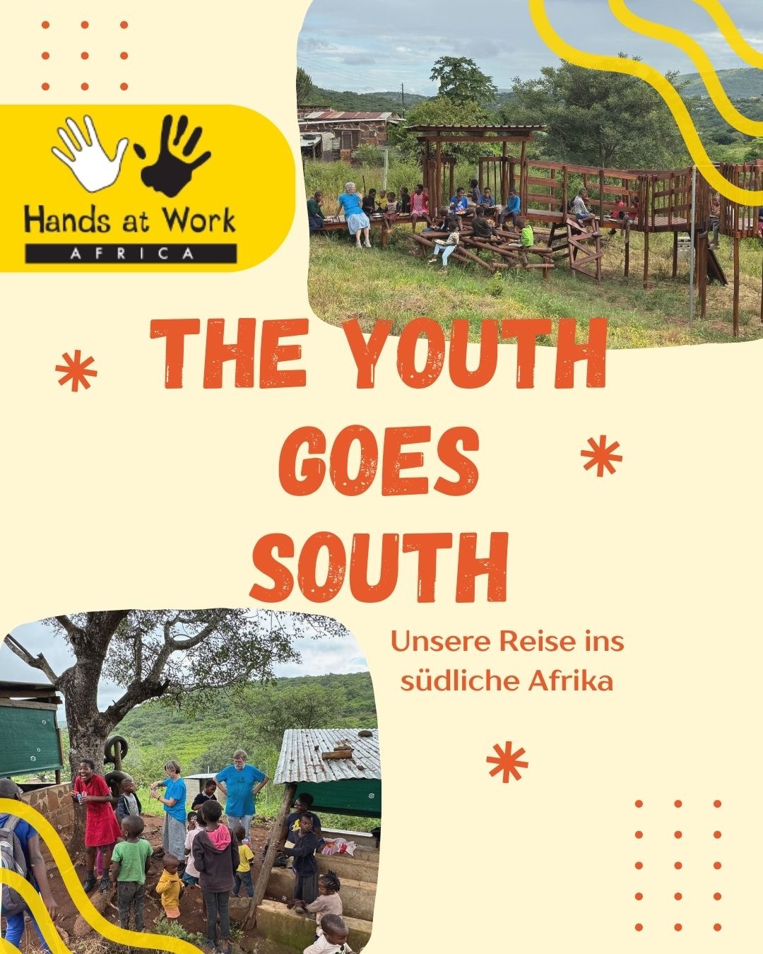 Im Juli 2026 reisen wir nach Südafrika und Eswatini. Unter dem Motto „The Youth goes South“ möchten wir die Arbeit von Hands at Work direkt vor Ort erleben. Die Reise bietet uns die besondere Möglichkeit, soziale Projekte nicht nur theoretisch zu betrachten, sondern mit den Menschen in Kontakt zu kommen, die täglich damit zu tun haben.