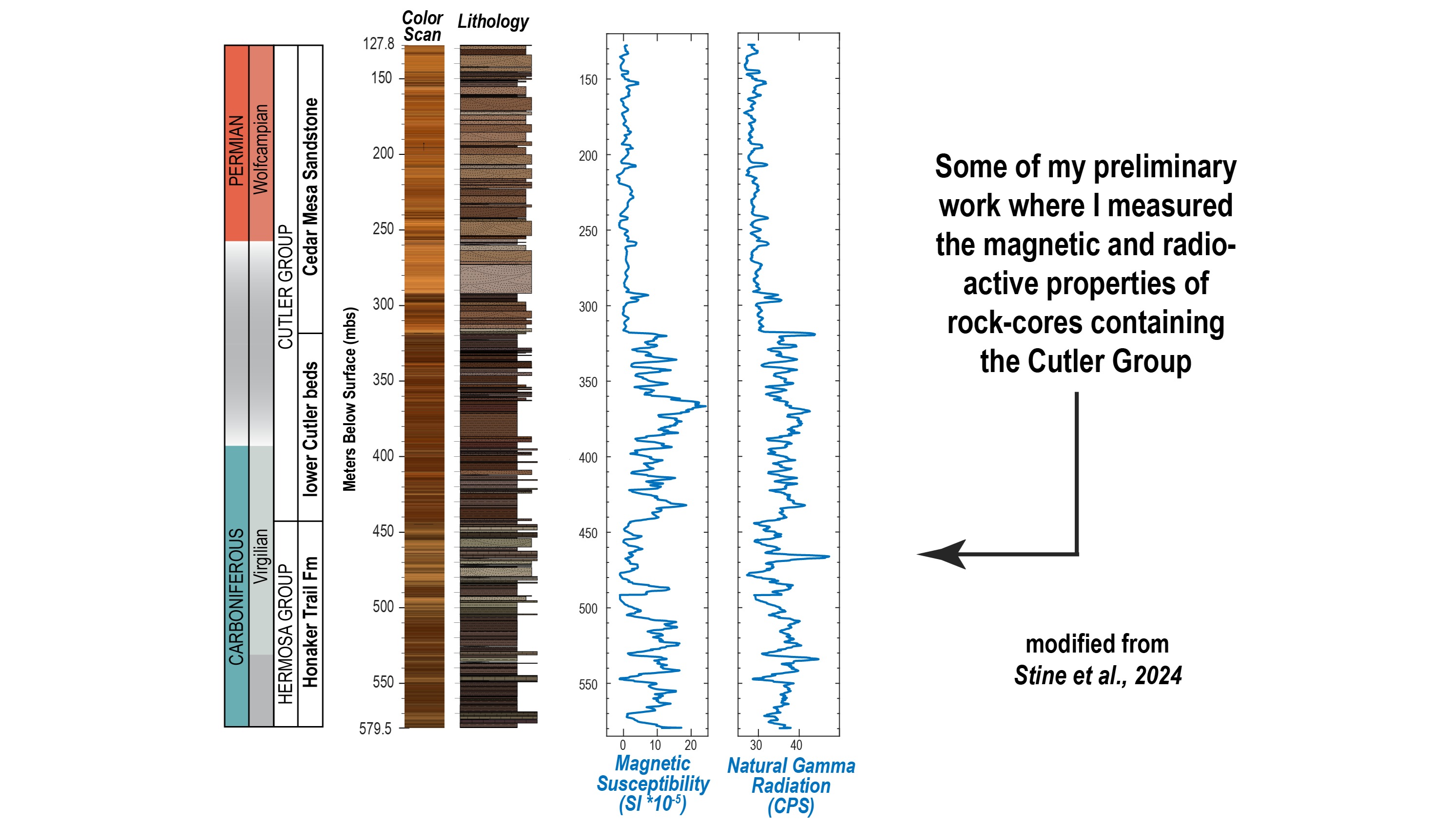 As part of my research, I am studying the magnetic, radioactive, and chemical properties of the Cutler Group. This will allow me to reconstruct the ancient climate and thus better understand how their environment influenced evolution of prehistoric life. So far, I have split, photographed, and measured the magnetic and radioactive properties of ~500 m (~1640 ft) of these ancient sediments in historic rock core (e.g., the Elk Ridge Core) as well as in outcrop exposures in Bears Ears.