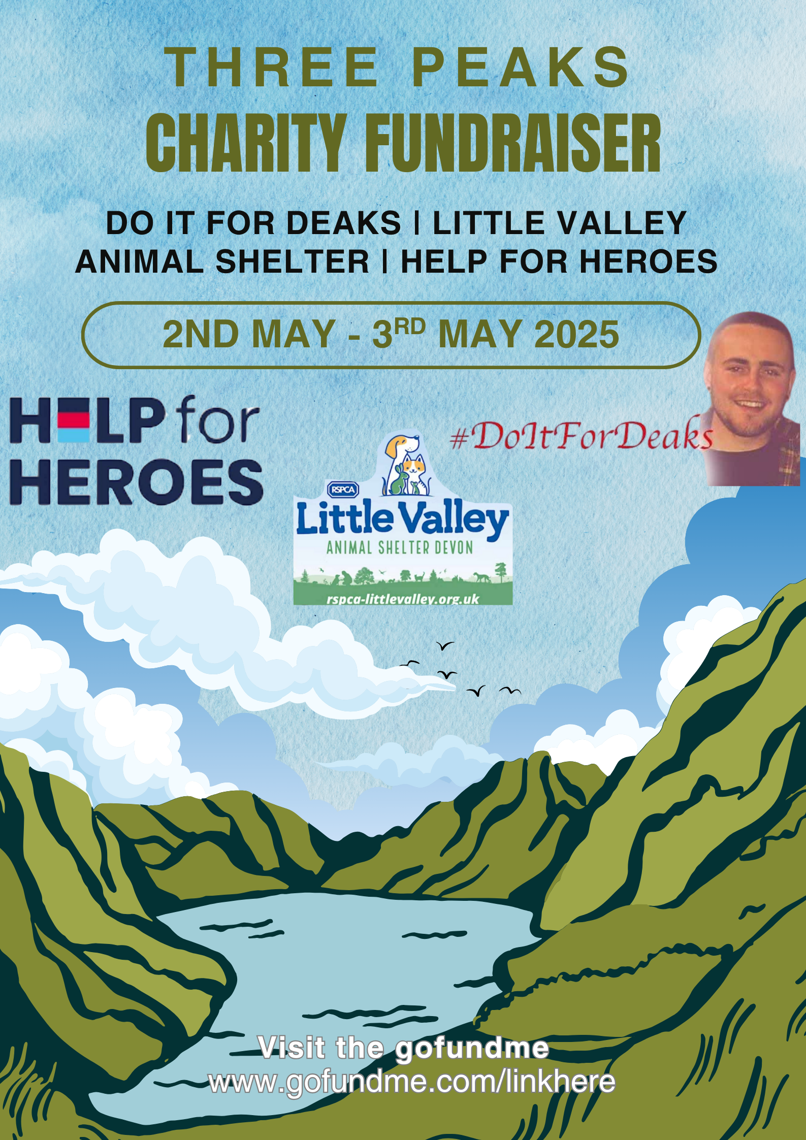 Starting in the late hours on May the 2nd and finishing in the early hours on the 3rd, I will be pushing my limits to conquer the Three Peaks Challenge in the fastest time I can, But I'm not doing it just for the thrill - I'm doing it for a great cause. Previously I have done it in a team completing the 3 peaks in 19 hours, but this time I'm going solo to raise even more vital funds for three incredible charities: Do It For Deaks, Little Valley Animal Shelter, and help for heroes. My motivation is deeply personal. Having lost a friend to suicide, I've seen first hand the devastating impact of mental health struggles. Do it for deaks is a great local charity which is dedicated to making a difference in our community. But that's not all. I'm also fundraising for Little Valley Animal Shelter, who provide a safe haven for animals in need, and help for heroes which supports those who have served our country.