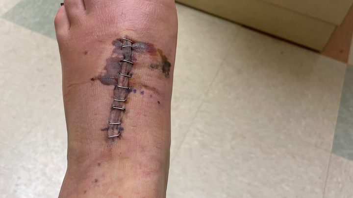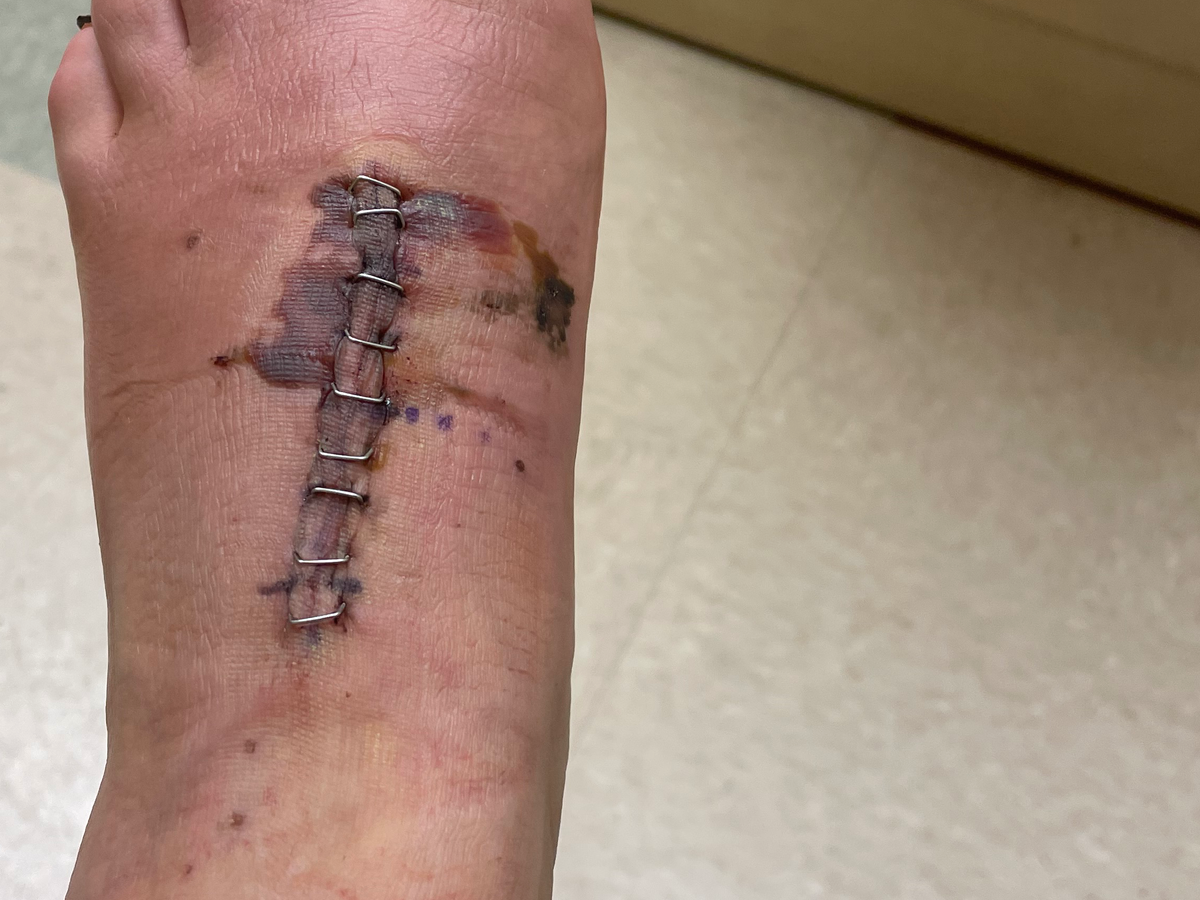 on January 26, I was at a trampoline park with my sis and the kiddos. I was running around playing tag when I heard a sudden pop. At first I thought it was the floor board but once the adrenaline came down I started to feel a faint tingle on my left mid foot. As it started to ache my foot began to swell and immediately started bruising.