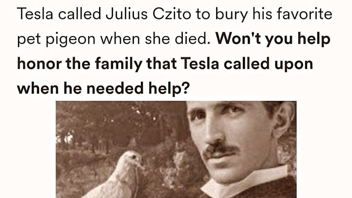 To honor their legacy, we are launching a fundraiser to add a marble statue of a pigeon to the tombstone/monument that will be placed at their resting place. The Czito tombstone will be crafted from striking Lightning Granite and will be a twin copy of the Lewis Latimer tombstone designed by the talented artist Stan Mullins. Known for his exceptional work, Mullins unveiled the Latimer tombstone at Oak Grove Cemetery in Massachusetts last year. This thoughtful design will also feature a marble carving of a white dove, lovingly sculpted by Samantha Newman, a renowned artist and Maple Grove’s first artist-in-residence. The dove not only symbolizes peace but also represents Tesla's profound affection for a special pigeon—a story that is intertwined with Julius Czito’s kindness and humanity.