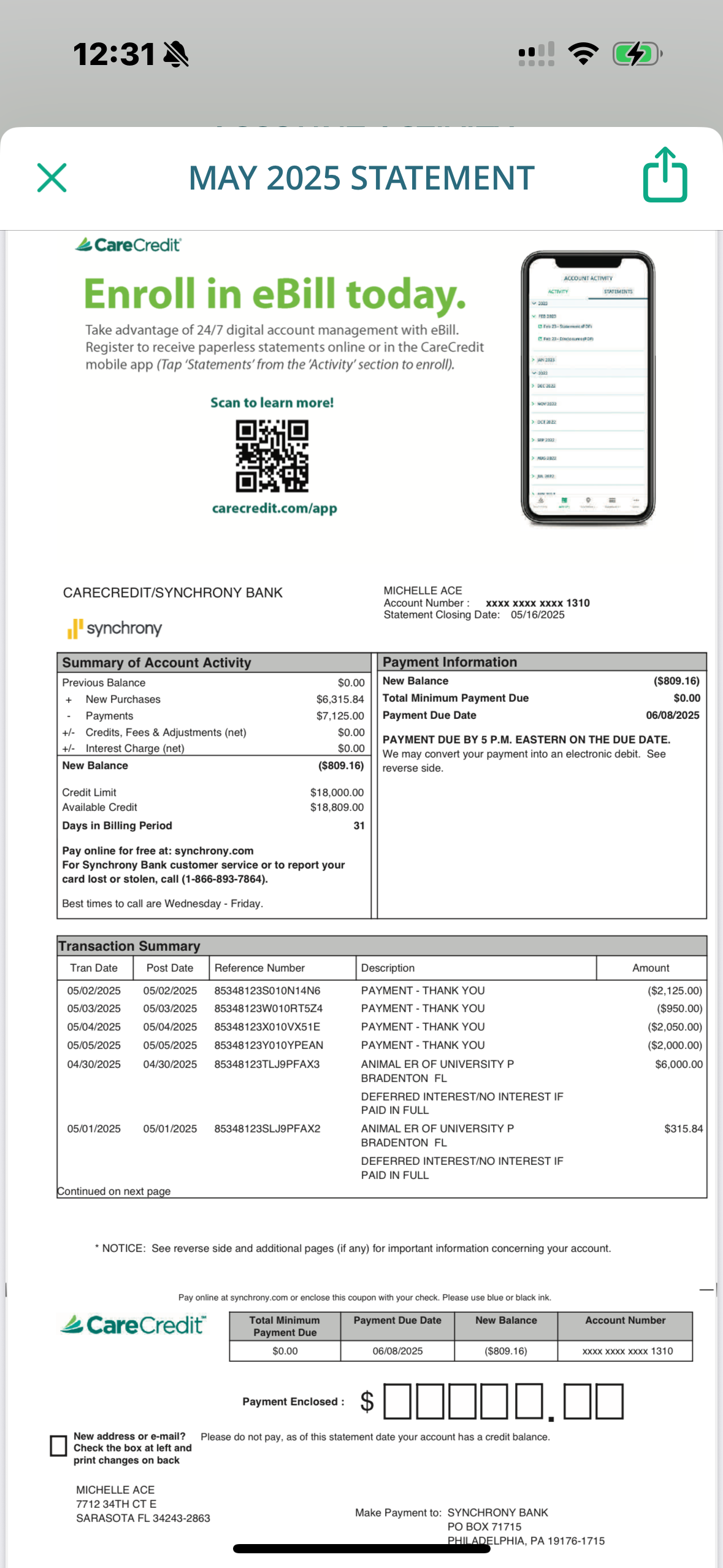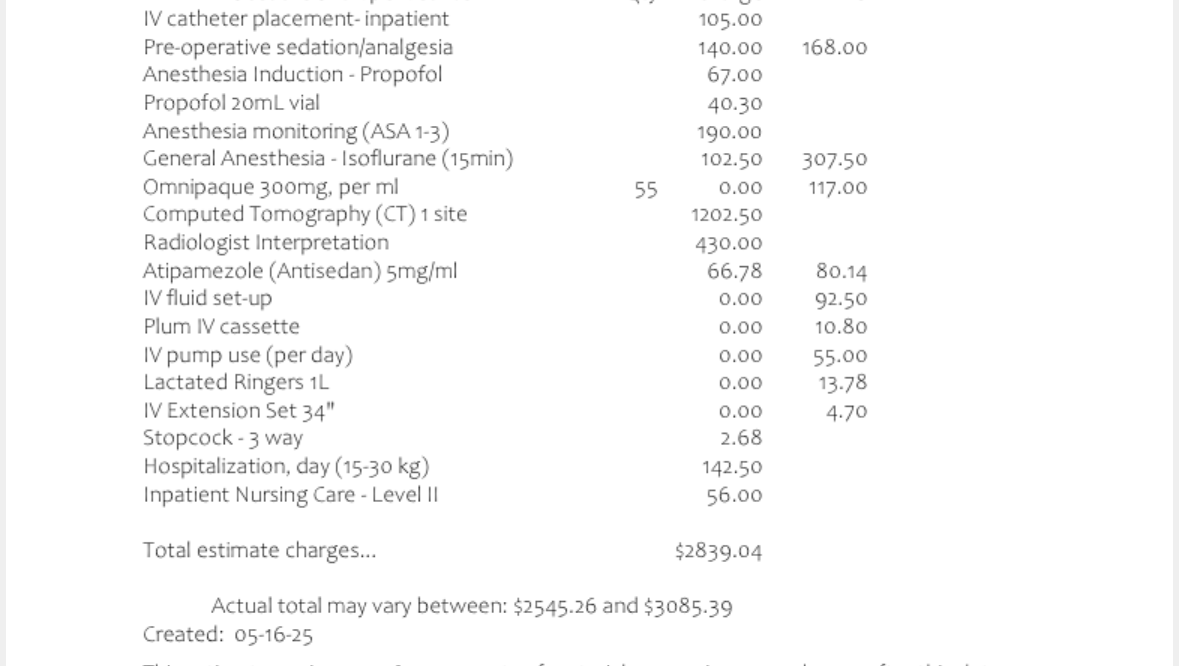 5/17/25: Update on Ace. We got the quote from Dr. Rose for the CT scans. I will post in photos. It’s in the ballpark of $2800 to $3000. The CT scans will allow the Dr. to see where the bulla is on his lung and also check his other organs impacted from the hit. I will update when the CT scans are scheduled.