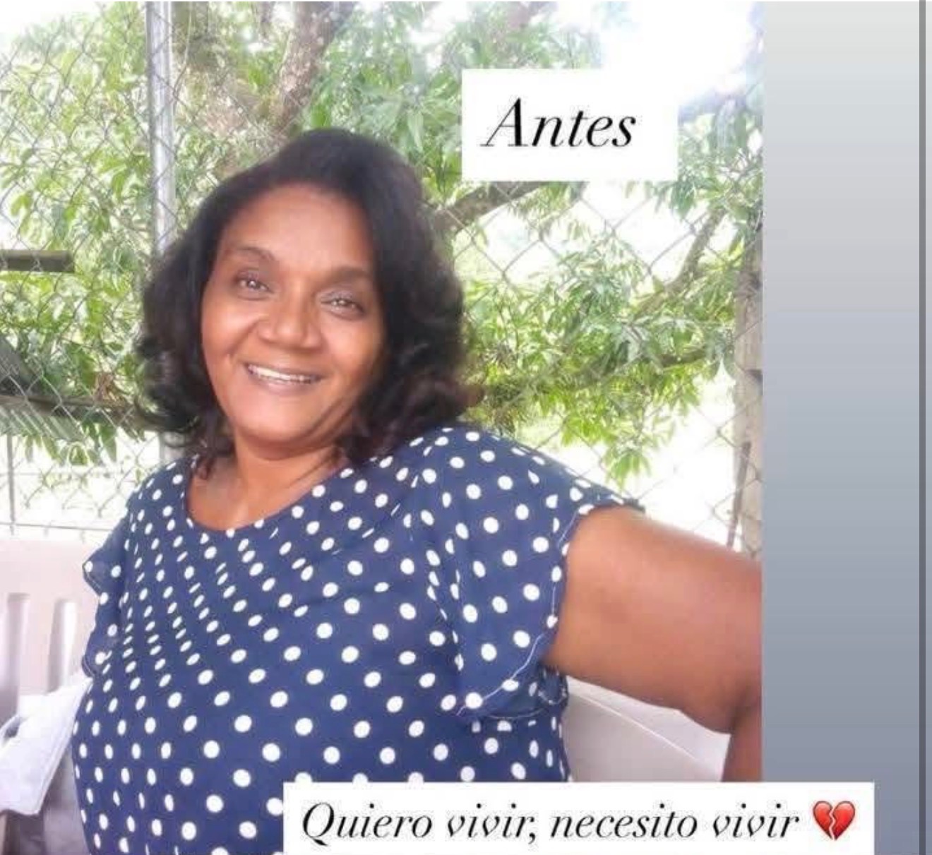 Hola a todos mi prima hermana esta pasando por la terrible enfermedad de cáncer de mama . Esta en tratamiento ella quiere vivir para ver sus hijos crecer estamos pidiendo su ayuda primero sus oraciones por ella su nombre es ADALGIZA ABREU JIMENEZ . Y luego cualquier ayuda financiera con la cual puedan ayudarla . No importa con cuanto puedas ayudar todo es agradecido y necesario por favor ayudemos a mi prima hermana ella quiere vivir gracias Ella vive en Santo Domingo y la situacion economica esta muy difficil si tiene cualquier pregunta me pueden Llamar mi Numero es [phone redacted]