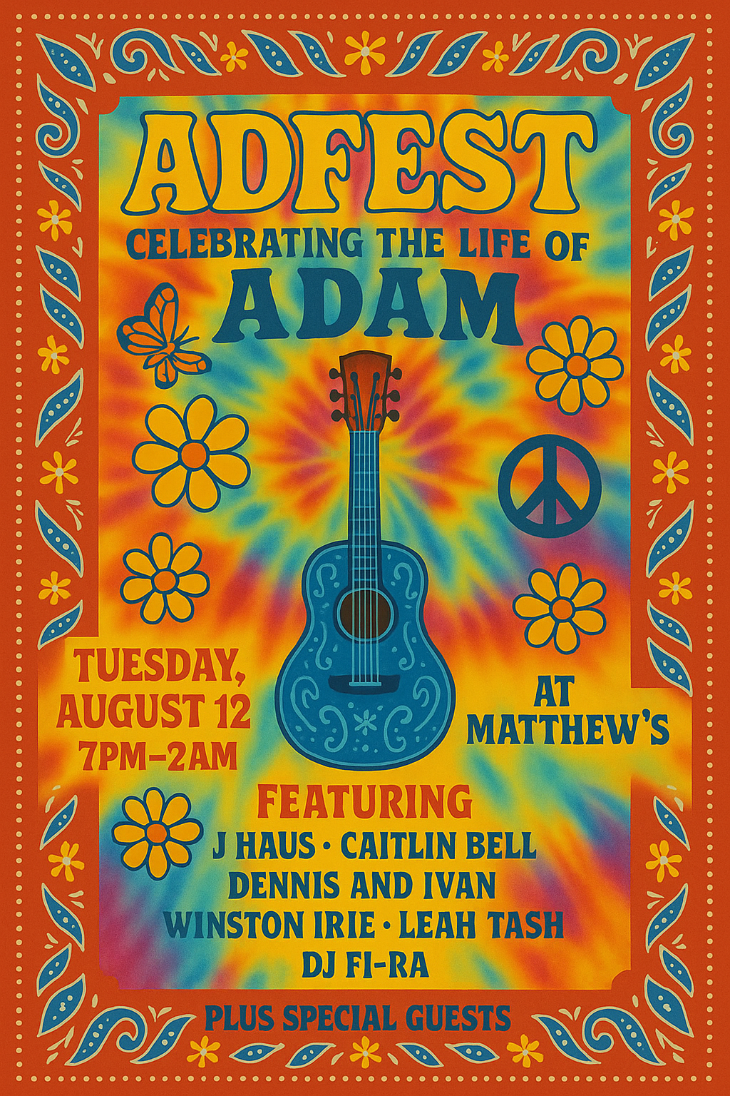 We are planning a truly special event to celebrate the life of Adam. We invite you to ADFEST on Tuesday, August 12th at Matthews for an evening dedicated to remembering him through music, love, and shared stories. Our goal is to create a heartfelt and joyful tribute for Lauren, the boys, and everyone who knew and loved him.