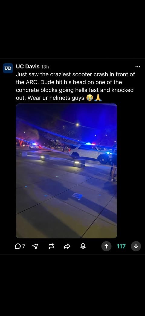 My name is Aditya, and I’m a UC Davis student studying Computer Science. Yesterday, I was involved in a serious scooter crash in front of the ARC. I hit one of the concrete blocks at high speed, fell, and suffered a concussion, multiple bruises, and six stitches on my chin. I was knocked unconscious for a bit and had to be taken to the hospital by ambulance.