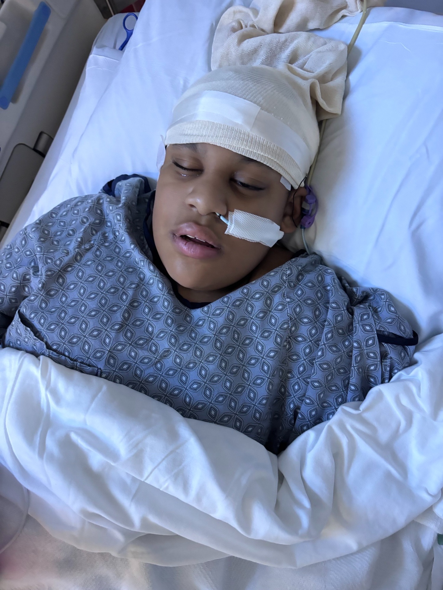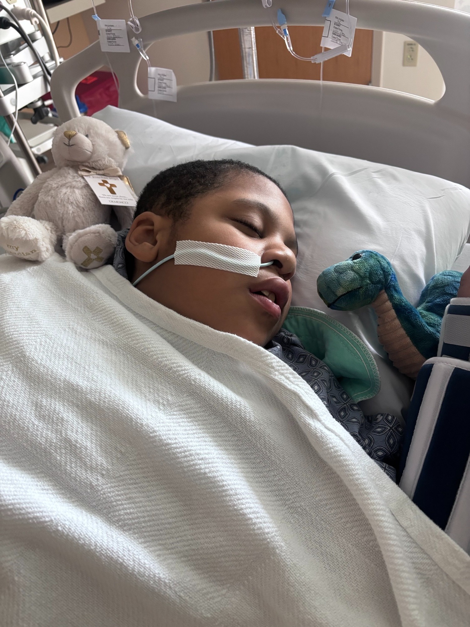 My name is Kim and Amari is my grandson of my daughter Courtney. On Sunday, November 9th, Amari abruptly stopped eating and drinking, but he does that sometimes, so we didn't think too much about it. But when Monday afternoon came and he also then stopped talking and making any of his normal sounds and being his happy outgoing self like he always is, she got nervous and called his neurologist at Boston Children's Hospital and let them know what was going on because she wasn't even able to give him his seizure meds or any of his medication for that matter. So, the on-call neurologist suggested we take him to Cape Cod Hospital because then if anything, they can get him his medication through IV. We do that, but it is harder than they anticipated, and we need to sedate him with some Ketamine and Ativan in order to get an IV in. We do that, get him his meds, but he's still not making any progress. The hospital then says that they are going to have to send us to Boston Children's via EMS. We get to Boston, they do a CAT scan, test for flu, COVID, and strep, and all come back negative, but his white blood cell counts were high, so they needed to figure all this out. Because he cannot tell us what is wrong and everything else, plus with the anxiety of him being in the hospital with all the doctors and everything, we had to sedate him and send him up to the MICU.