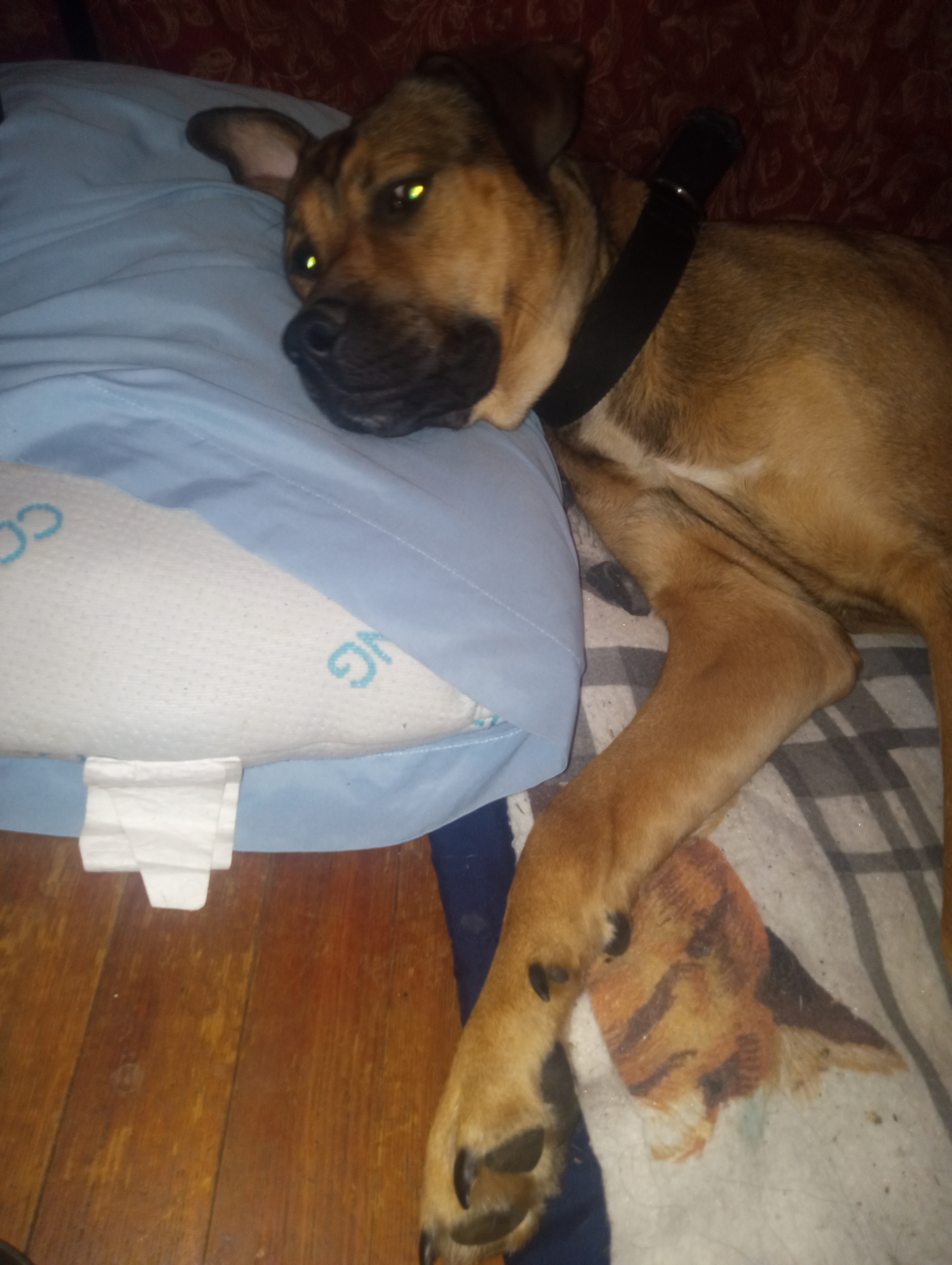 I have not had the chance to get him all his shots as we are on social security. I just renewed our lease on our apartment for another year, so I will have the money next month, but Rocco started limping yesterday morning and now he won't get up at all. I have been icing it and giving him canine aspirin, but he won't even get up to go to the bathroom. He won't drink water, but he is licking and chewing on ice. He hasn't been eating, but he did eat a hamburger and a chicken patty today.