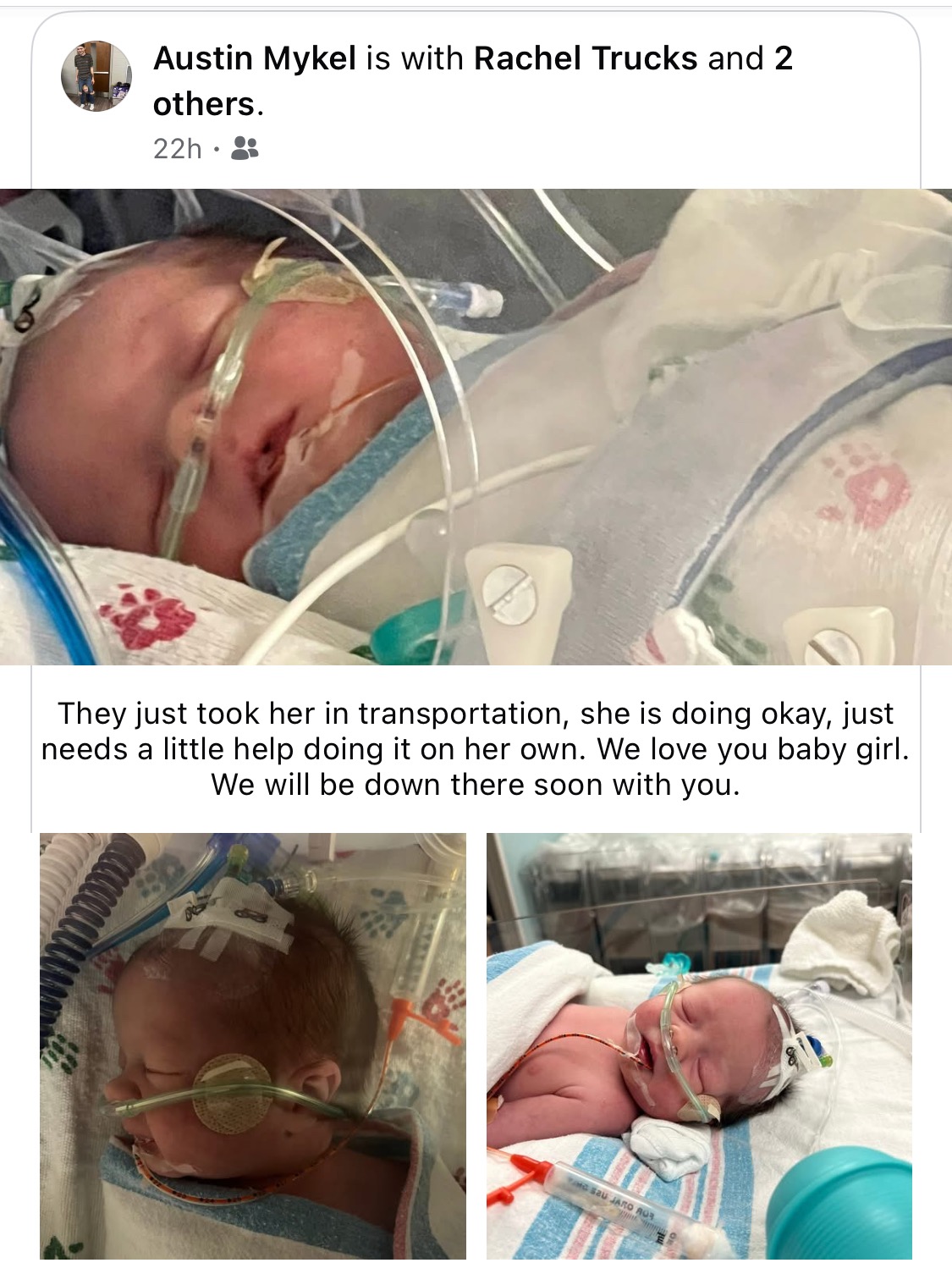 I am reaching out to you today with a heavy heart and a humble request for support. My son and his family are facing an incredibly challenging situation as they navigate the heartbreaking journey of caring for their precious baby girl,(my granddaughter ) who has been transferred to the UAB NICU due to breathing and lung issues.