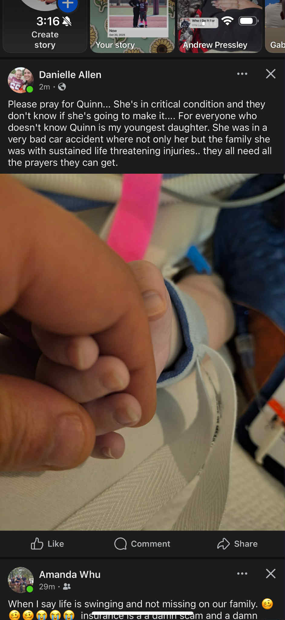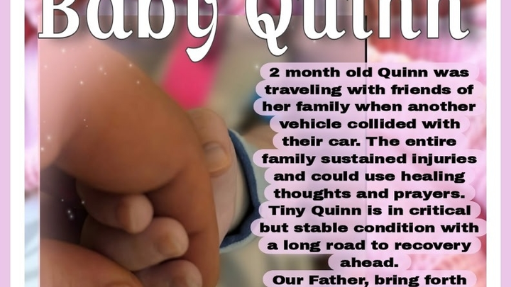 I created this GoFund me for my 2 month old granddaughter; Quinn, who is currently in the ICU. She was in a horrible car accident with friends of my daughter’s. She was life-flighted to the hospital on the 19th. She sustained multiple scull fractures, orbital fractures, brain hemorrhaging and is currently sedated. I’m trying to raise money for travel/food costs to help take away some of the financial stress for family coming to the hospital to sit with her & medical costs & lawyer fees that will be associated with her accident. Please keep her in your prayers. She’s not out of the woods yet, so please, please, please, send any and all healing vibes you can!!! I’ll try to keep everyone updated as much as possible. Thank you to my friends and family for your support during this difficult time.