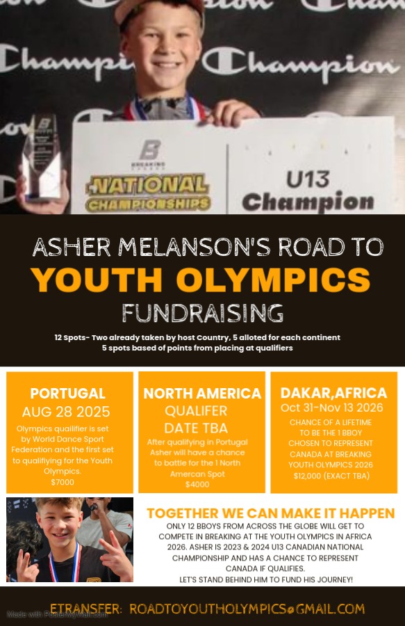 Asher has been selected to represent Canada at the 2025 World Breaking Youth Championships in Porto, Portugal August 25-31, which serves as a qualifier for the 2026 Youth Olympic Games in Dakar, Senegal. To qualify for the Youth Olympics in Africa in 2026, Asher must compete in both a worldwide qualifier in Portugal and a North American continent qualifier (date TBA). There are 12 dancers that will represent their Nation at the Olympics. Two of the spots are given to the Host Countries, 5 spots are given to points winners at the worldwide qualifier and 5 are given, one to each Continent at the continent qualifier. He is a two-time U13 Canadian national champion and a dedicated ambassador for Indigenous youth, exemplifying discipline, talent, and pride in his Métis heritage. More info/videos can be found The Spot Arts Community where Asher trains in Saskatoon.