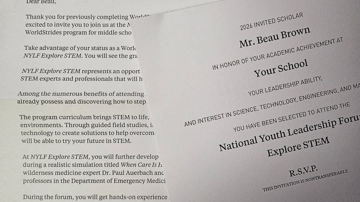 We are beyond ecstatic to share the news that our son Beau has been invited to attend the 2026 National Youth Leadership Forum: Explore STEM!