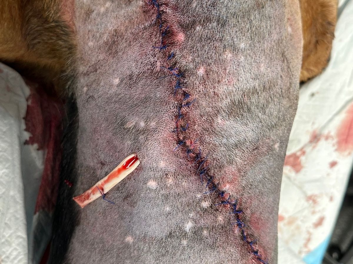 My name is Mark. I'm trying to raise money for our dog, a Fox Hound named Bella, that was shot on 12/14/2024 by a hunter at approximately 8 a.m. in the morning. She made it back to our home with the wound the picture shows. It was a miracle she got home, never mind making a 30-mile trip to a 24-hour emergency vet.