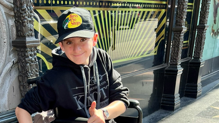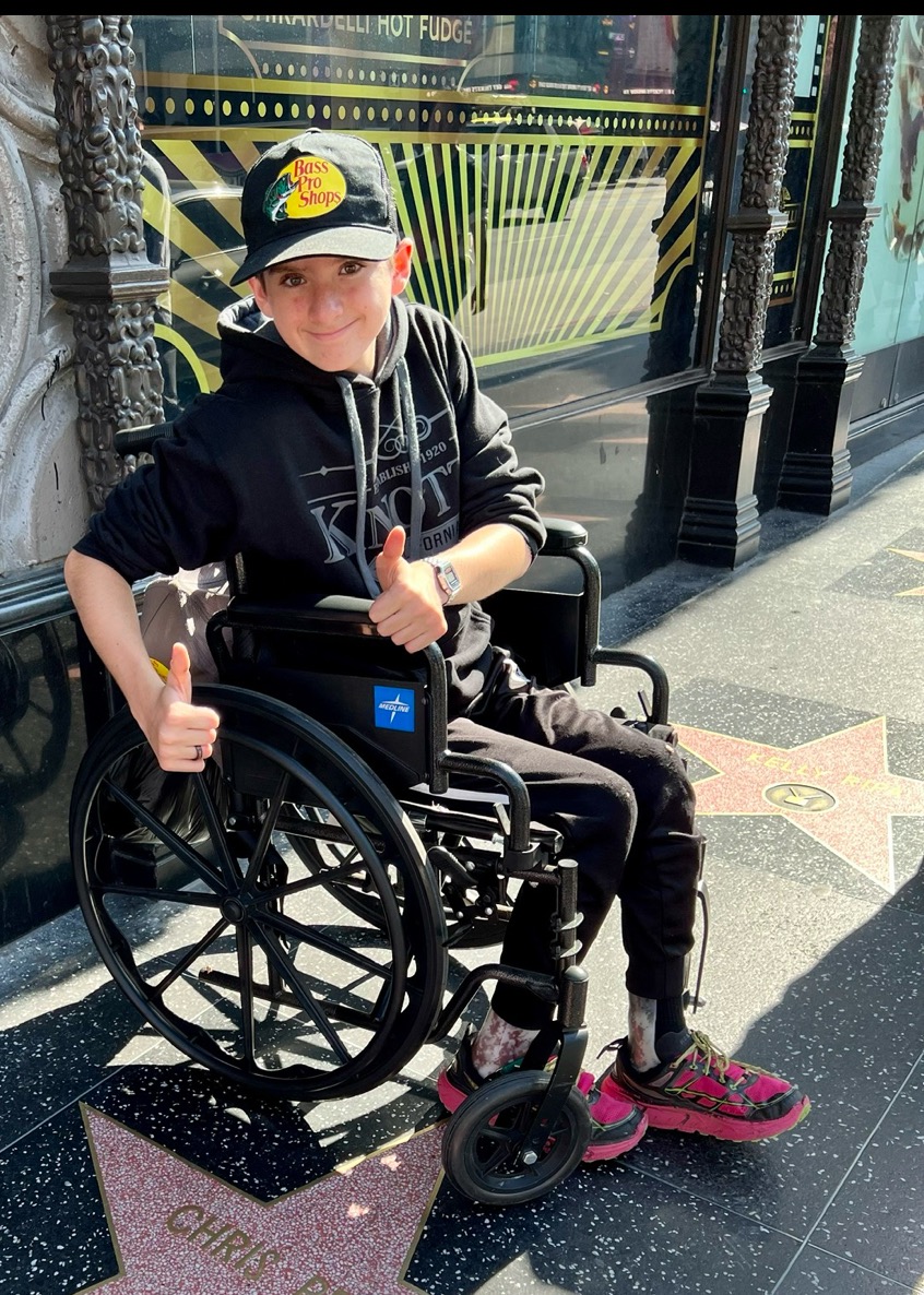 He was born with Spina Bifida, so he has braces on his legs but walks, is in martial arts, and is just a cool guy! He has had 14 surgeries in 15 years; he is one of the bravest people we know!