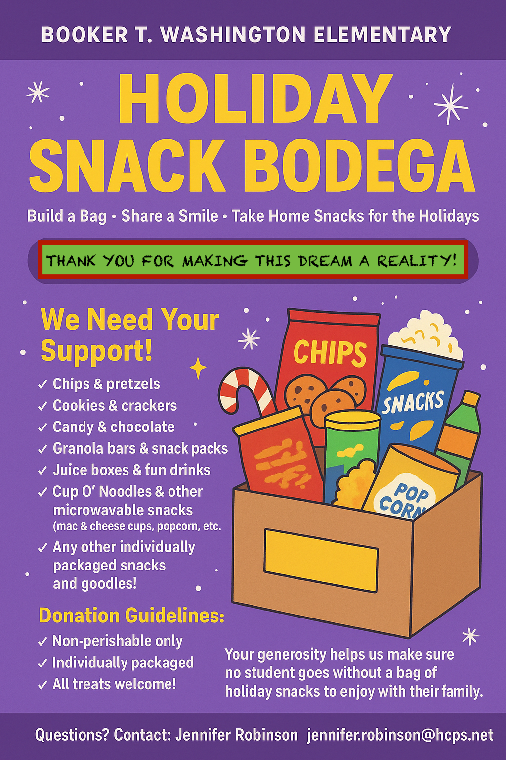 Please help us stock the shelves with snacks so every student can go home with a full bag of holiday cheer.