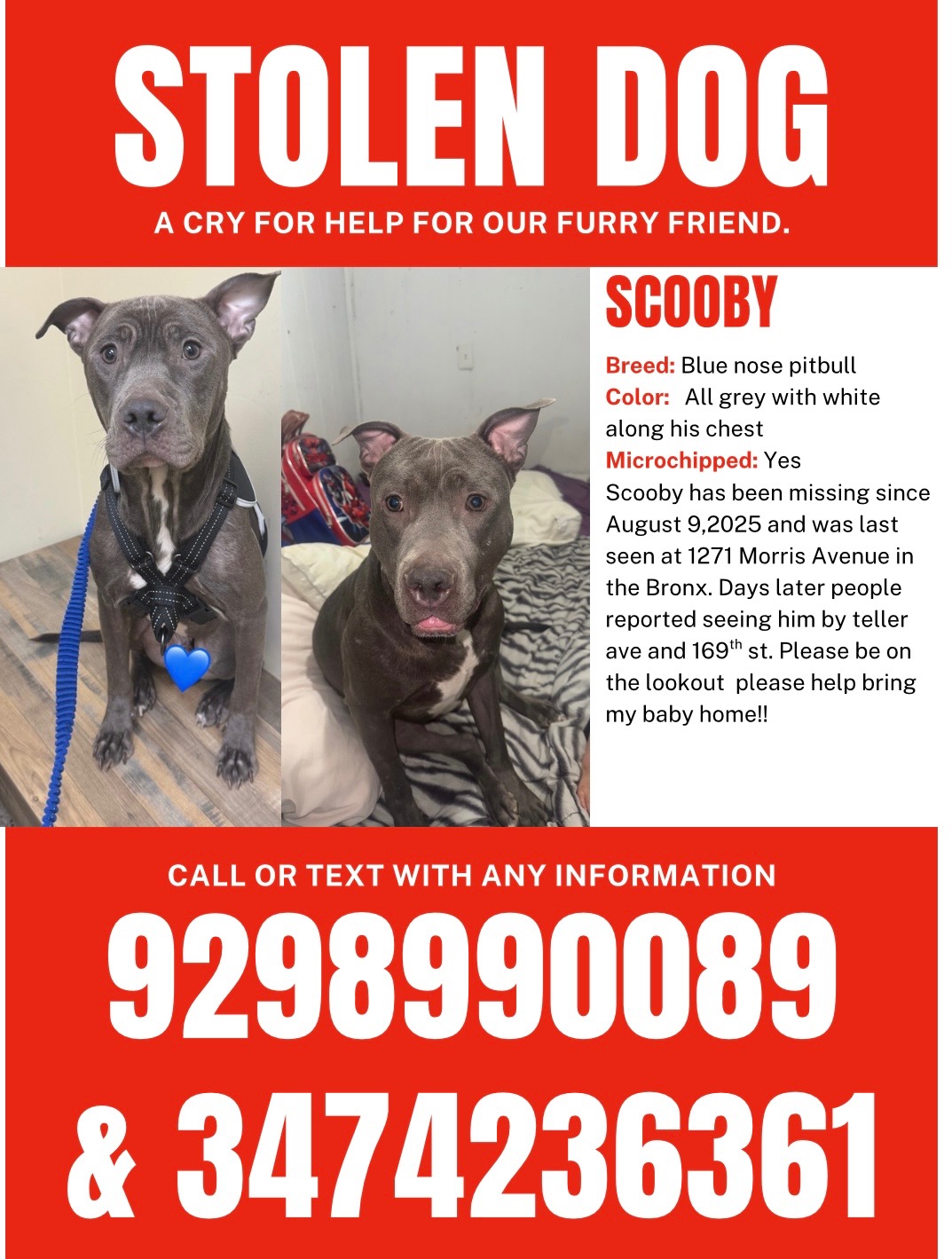 His absence has taken a serious emotional toll on all of us. What makes this even more heartbreaking is that we recently lost another one of our dogs, and the pain is still very fresh. The thought of losing another beloved pet is almost too much to bear. We’re trying to stay hopeful, but every day that passes without answers makes it harder.
