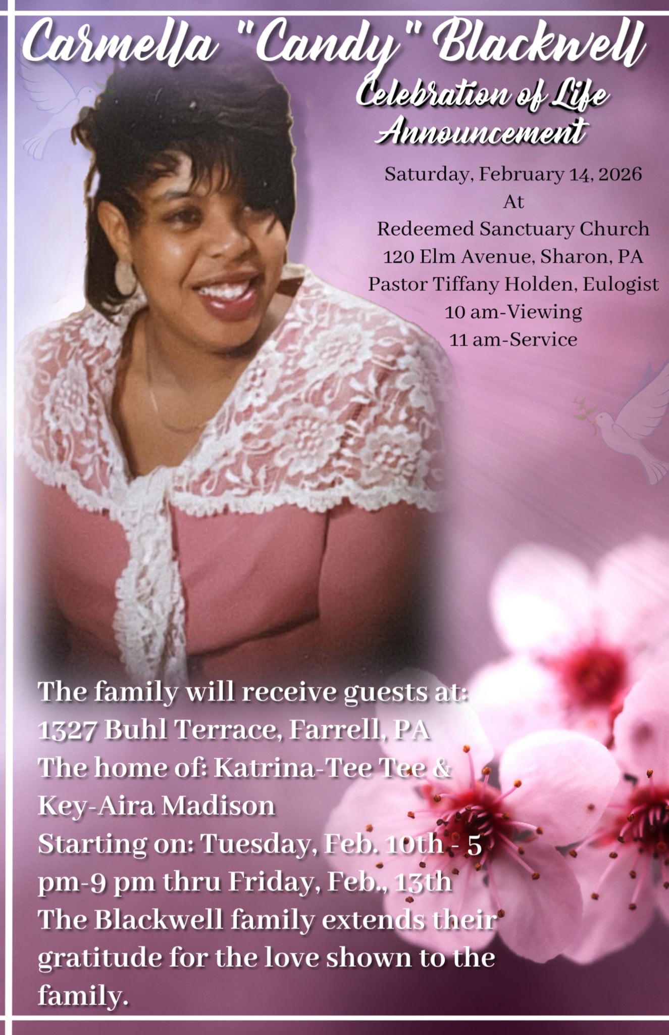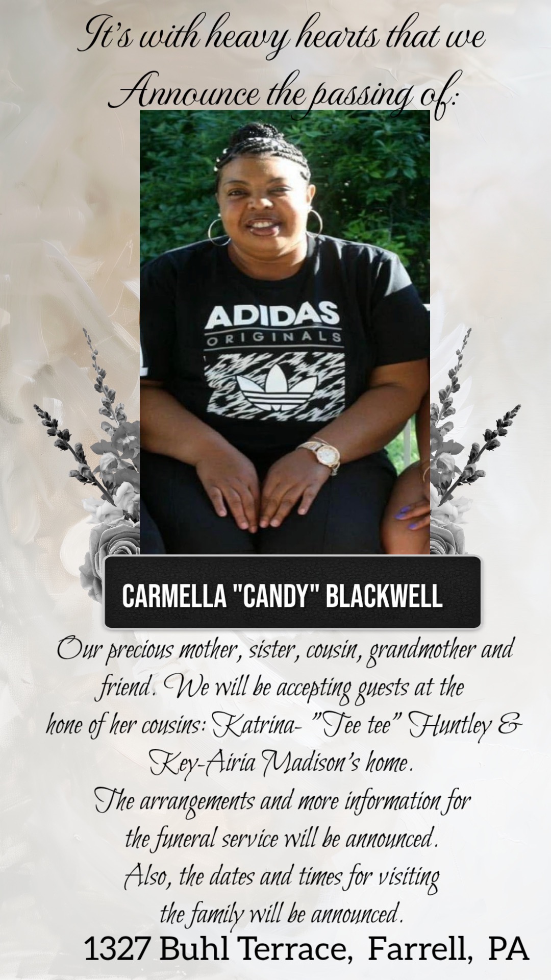 If you are able, please consider donating, sharing this fundraiser, or offering kind words of support. Your generosity and compassion mean the world to our family as we remember and celebrate Carmella “Candy” Blackwell’s life. Thank you for being there for us.