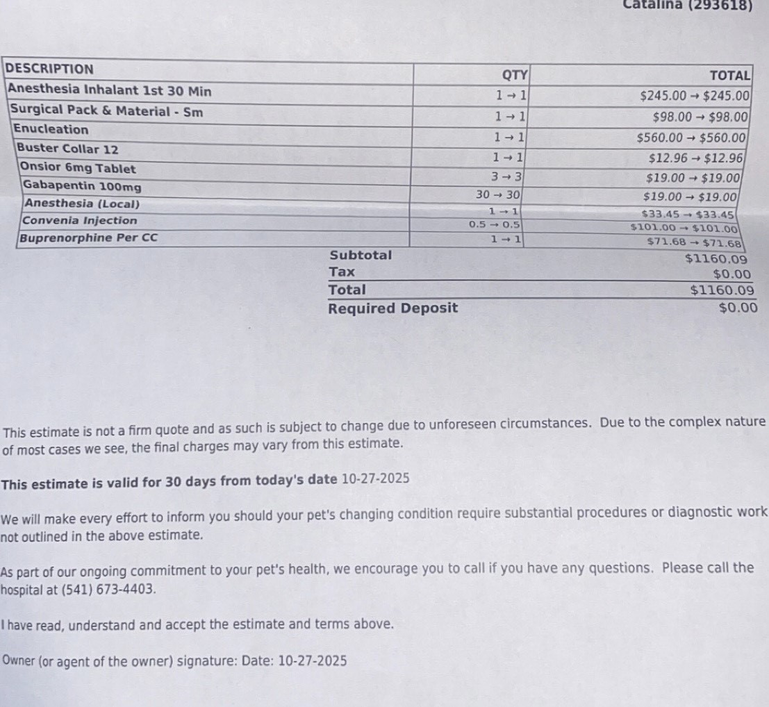 When we took her to the vet, we received heartbreaking news-the injury is not just an ulcer. The vet said that her eye is badly damaged and must be surgically removed. The estimated cost for the surgery is $1,160.