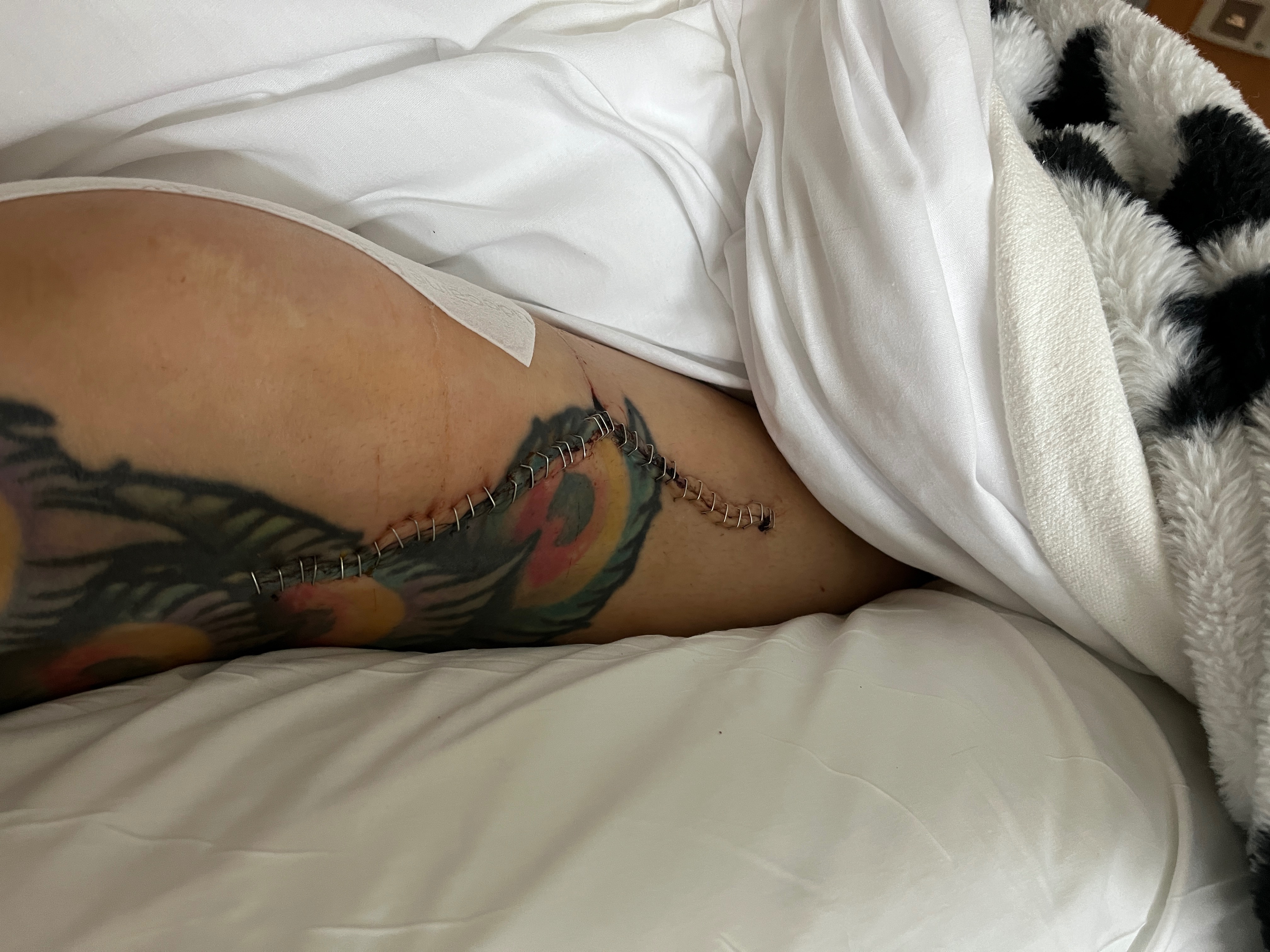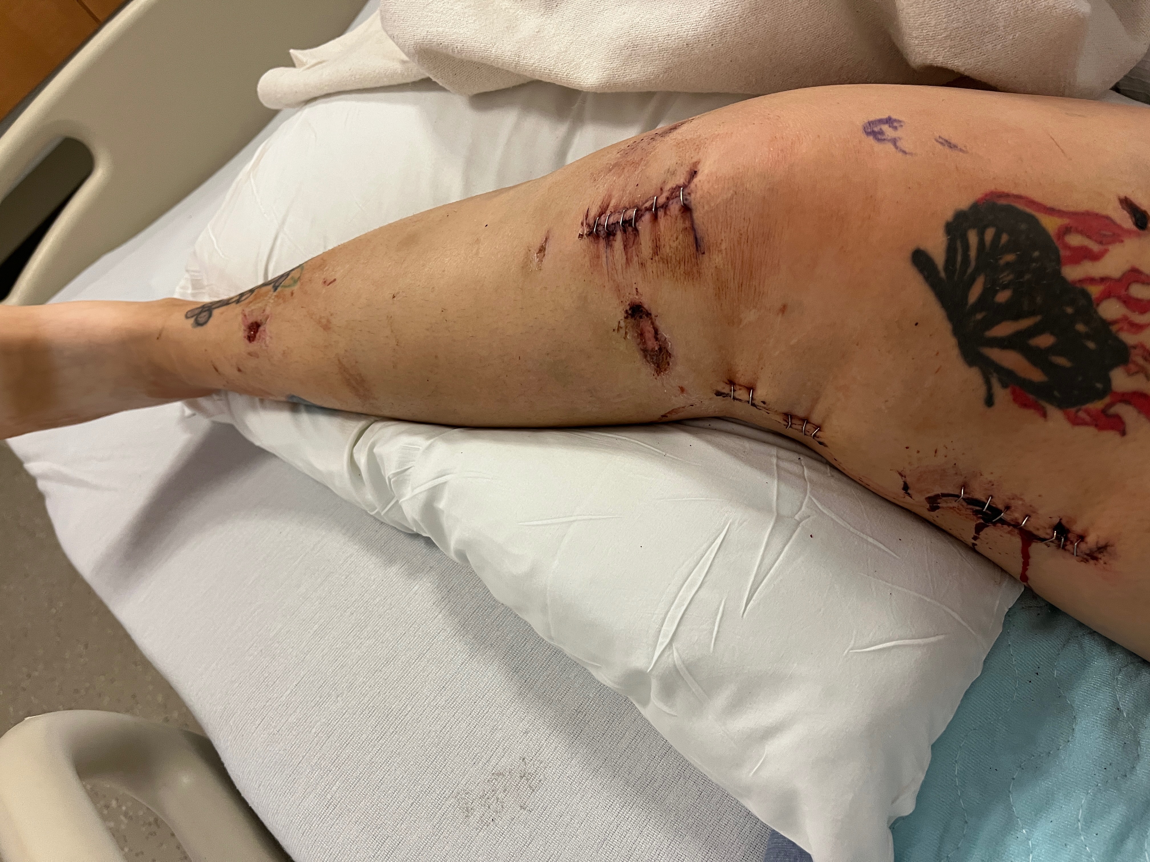I was in the hospital for a week and they released me that following Friday to go home and heal. I have a hospital bed in my basement now. Before they discharged me from Reading Hospital, I pleaded with them to run more tests. I just didn’t feel right. I was sweating profusely, my heart was pounding, and my right leg hurt so bad. Yet the hospital assured me that with time I’d feel better. Less than 24 hours after I was released from the hospital, my pain had tripled and my leg was beyond swollen. My mother said maybe I twisted the wrong way in my sleep, so I iced my knee and wore my immobilizer and toughed it out. Till Monday came and I couldn’t bear the pain anymore. I called an ambulance to take me back to Reading Hospital. When I arrived at the hospital, my right leg was profusely leaking fluids through my staples. The hospital kept me on IV antibiotics and kept me. Wednesday came and it was decided I would undergo another surgery, this time to open my leg and manually wash the infection out. Mind you, I told them I felt sick and they didn’t listen and they dismissed me. I remained in the hospital till Monday, August 11, when they finally discharged me with a PICC line to administer IV antibiotics myself 3 times a day till September 17, at which time I will be scheduling a third surgery on my right leg to now take the contaminated hardware out. It is yet unknown whether they are straight taking the hardware out or whether they will need to replace the hardware.