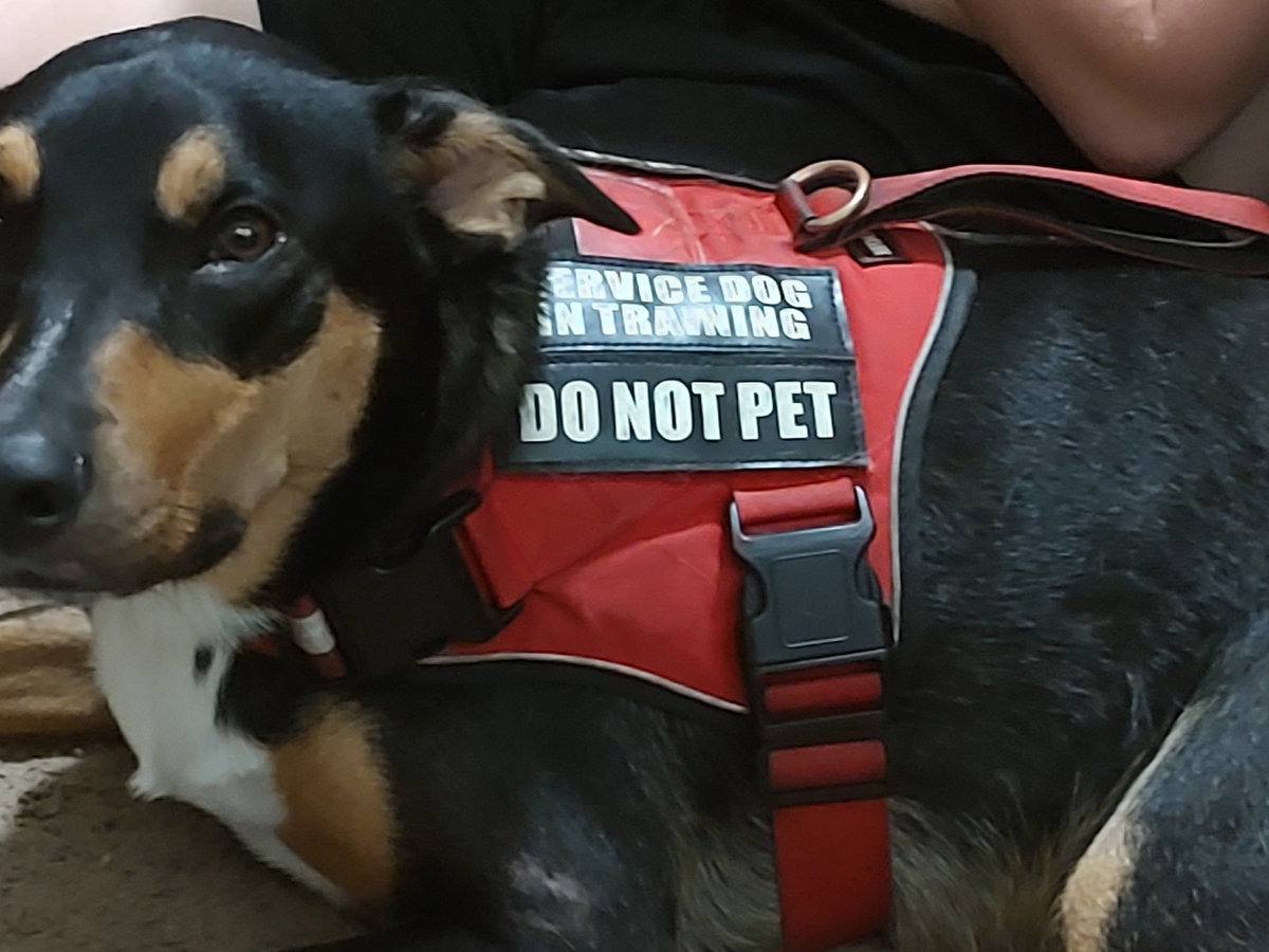 Hi! My name is Maverick and I am a 1 1/2-year-old Australian Kelpie. My owner, Cody Lowery, went all the way to Missouri to visit his grandparents, and while there, he was looking for a puppy to get trained as a service dog. Guess what... he found me. I was 9 weeks old. It was love at first sight. He named me Maverick because he loved Top Gun and his oldest brother was in the Navy. I am his Maverick to his Goose. LOL... I started learning to sit, stay, and give paws when told which one they want. Yes, I know I'm cute that way. I am practicing down stay on a leash, which I do most of the time but am still learning. I can tell when Cody needs help or is in pain, so I am right there with him. He holds me, and then I go get Grandma. Otherwise, I won't leave him. He's stuck with me. Now I have to have all training stopped because of an accident that happened to me. Let me tell you what happened.