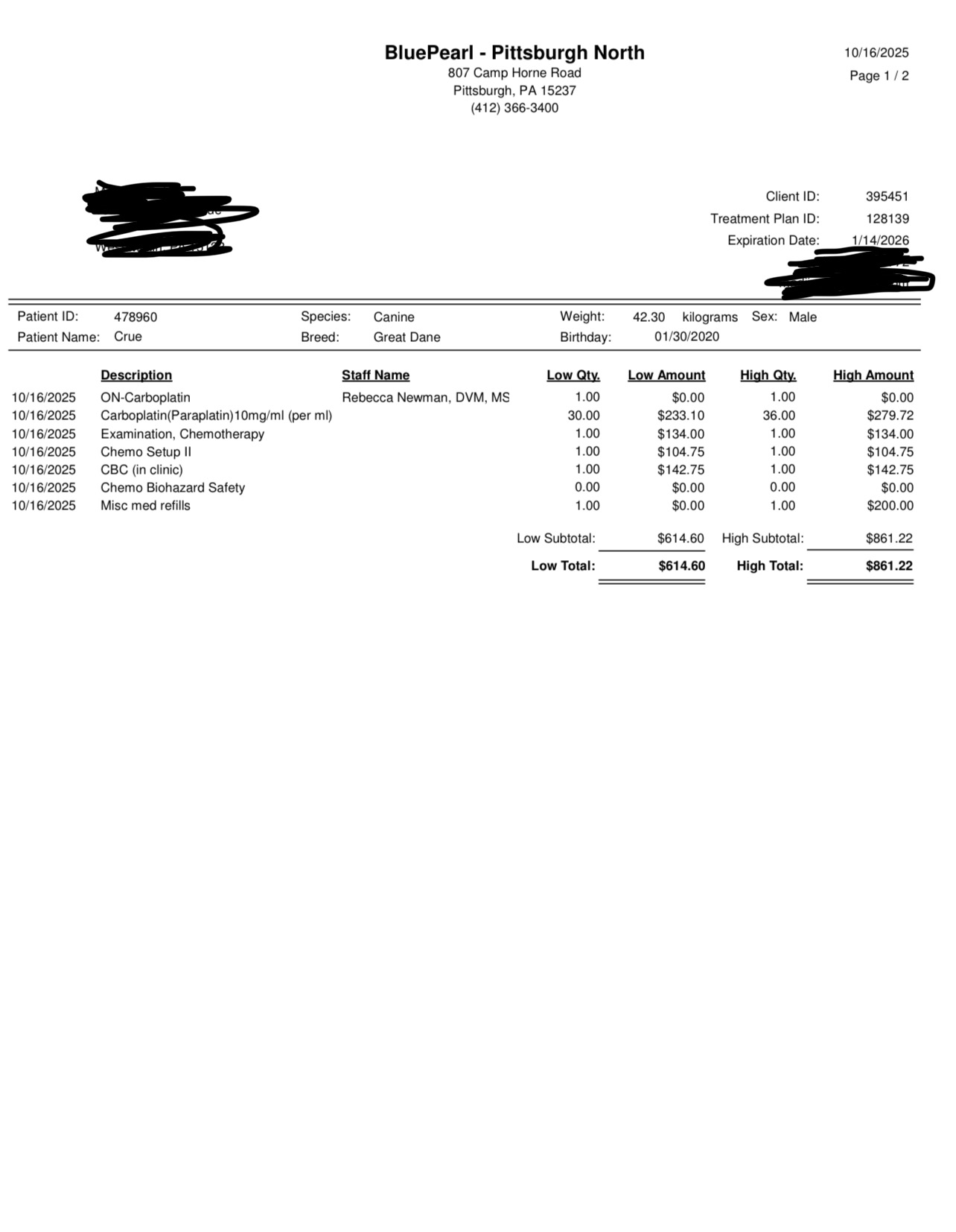 I have included some pictures of Crüe, along with an estimate for how much each chemo treatment will cost. There are 5-6 treatments total as well as radiographs needed.