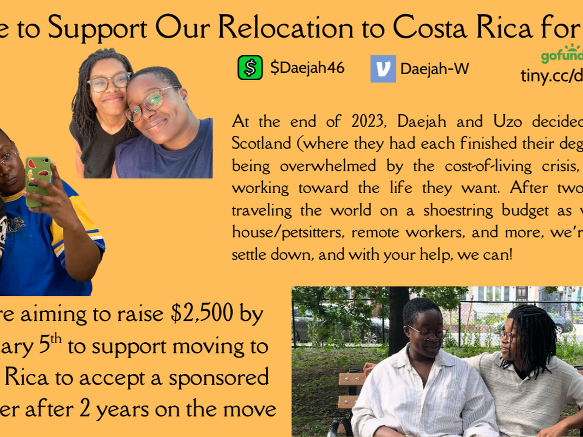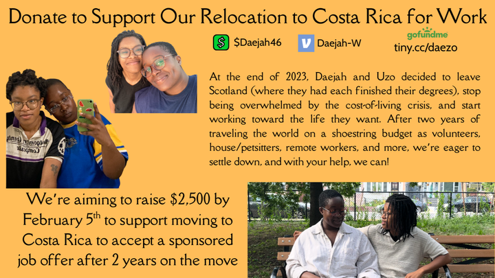 For those who don't know, we're Daejah and Uzo. We're a Black queer couple that has been slow traveling, volunteering, house sitting, and working around the world for 2 years. Now, we're hoping for your help to have a stable home again as Daejah accepts a sponsored work position in Costa Rica!