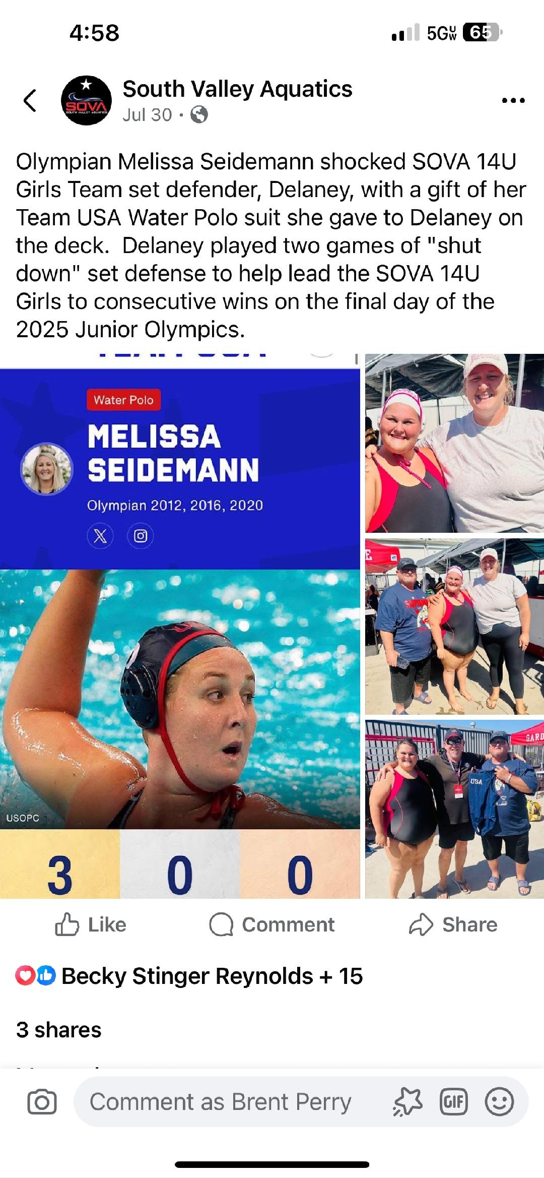 At a recent Junior Olympics tournament, I experienced a wardrobe issue with my swimsuit. Fortunately, the situation was resolved, but something incredible came out of it. Melissa Seidemann — a three-time Olympic gold medalist in water polo — heard about what had happened. On the last day of the tournament, she came to watch me play two games.