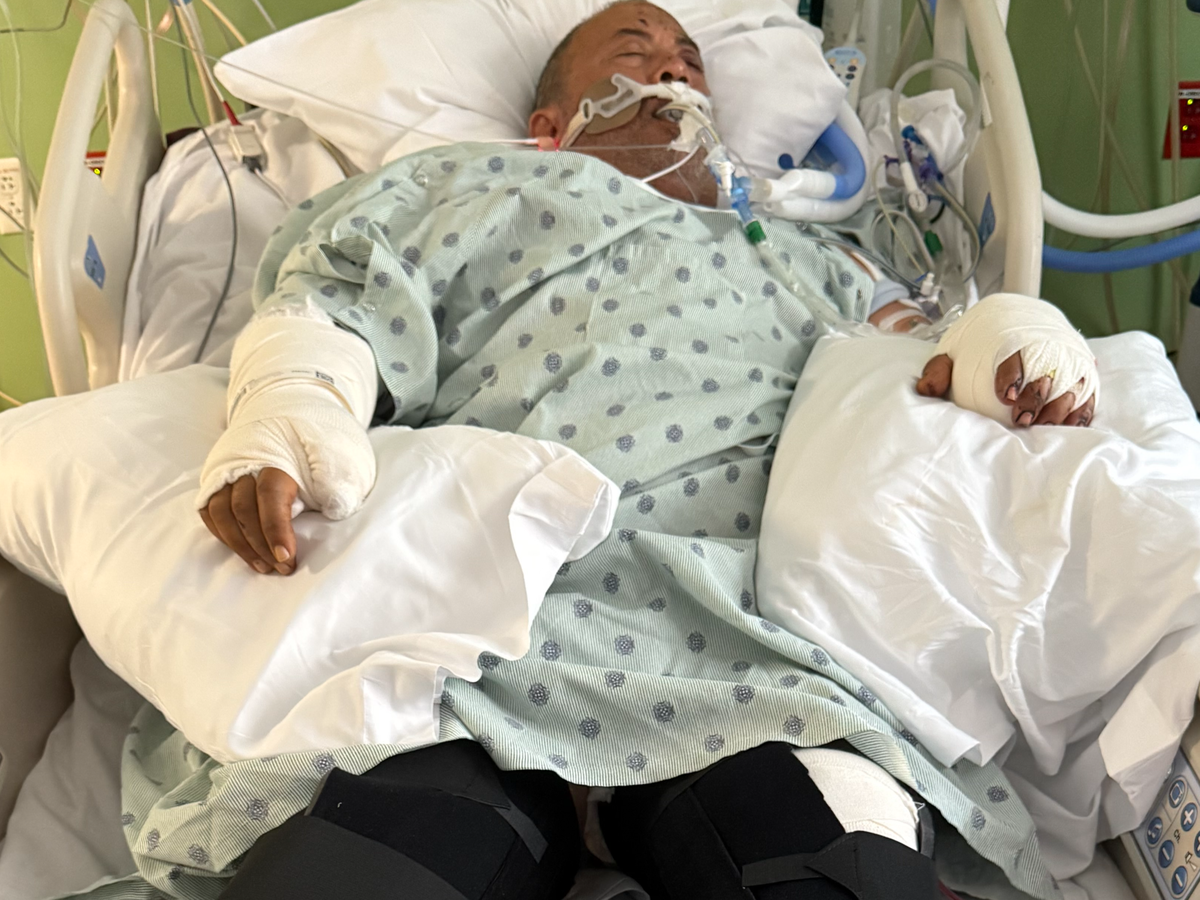 He's currently battling for his life in the ICU at Holmes Regional Medical Center in Palm Bay, Florida. The list of his injuries is almost unbearable: six blood transfusions in the last 5 days, multiple surgeries, with the most recent one this morning, two broken hands braced with pins, a fractured foot, broken toes and fingers, devastating internal bleeding, a shattered pelvis, a right leg tragically separated from his spine, a bruised heart and lungs, a mural lesion (a separation of the dermis from the underlying fascia), and a ruptured bladder. He's now reliant on dialysis, and possibly an organ transplant.