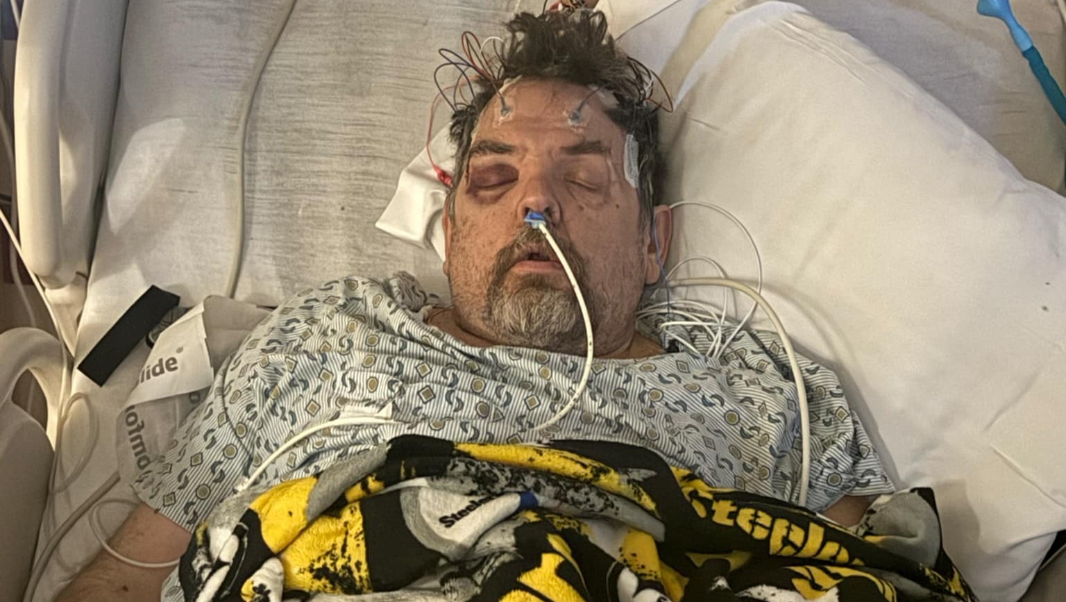 Monday at work Ed fell and suffered a very bad concussion and brain bleed and has been in the ICU withno timeline of stepping down. The fall caused not only the bleed in his brain but a deep gash on his right eye which needed stitches.