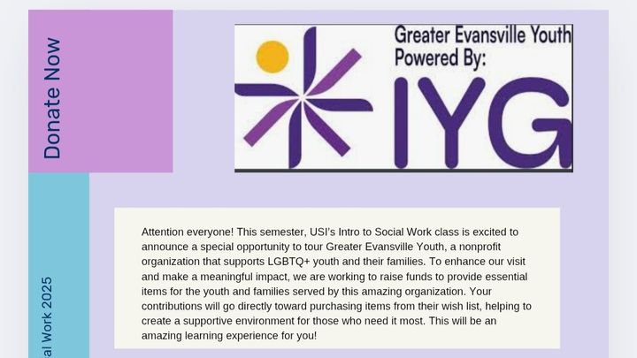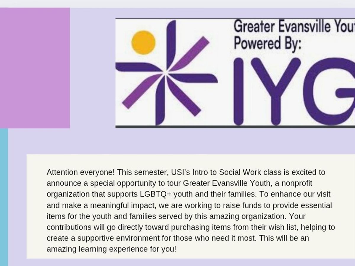 USI intro to social work class is raising funds for EGY to give on the day we go tour their facility. This allows us a partnership in which social work students get hands on experience and we get to give back to our community. As you may know, LGBTQIA +youth in Indiana are suffering already, and there isn't much hope in the near future. It is a terrifying time for the youth supported by EYG; We are grateful to EYG and the work they are doing to give these kids a place to belong