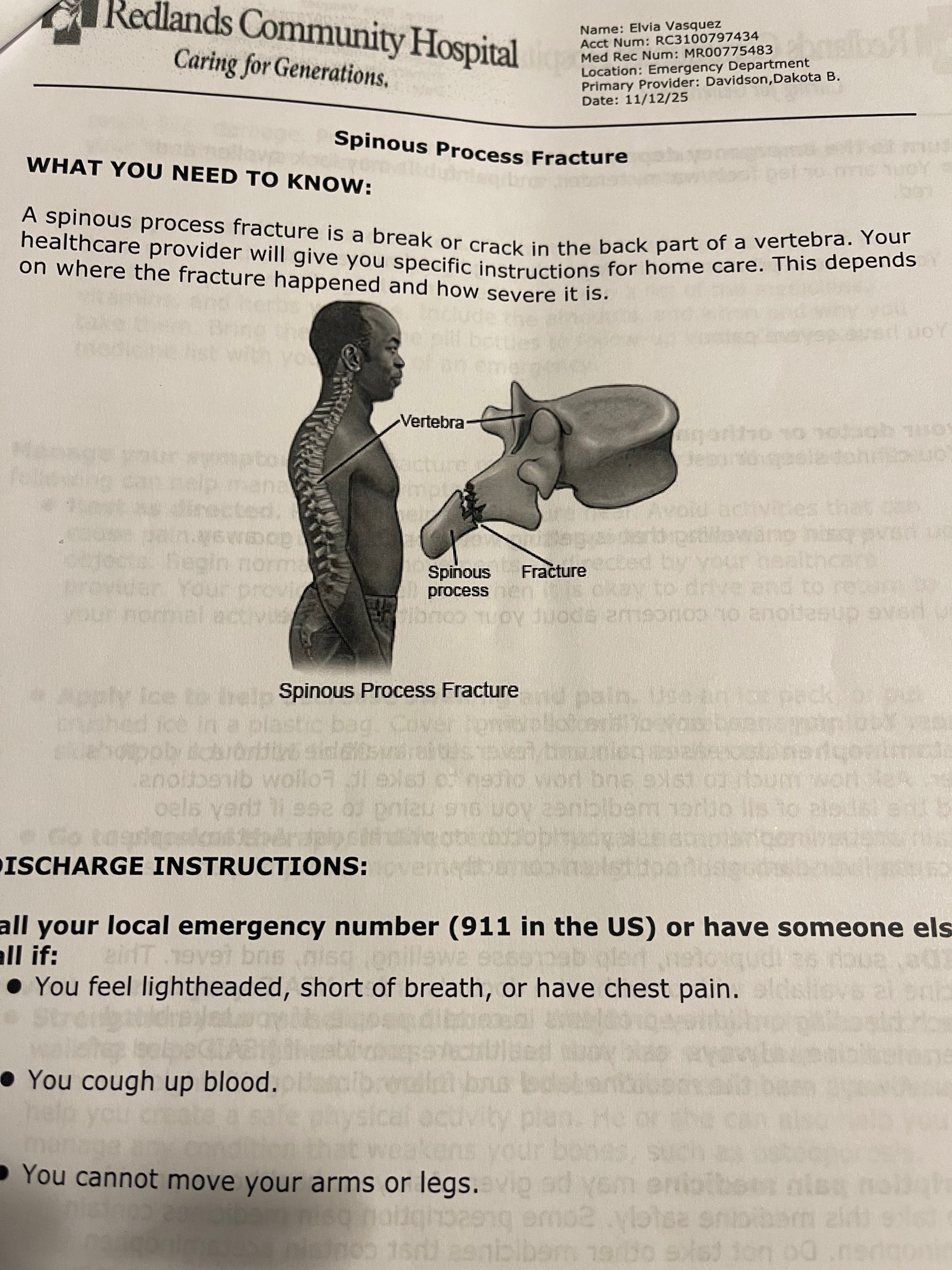 On November 12, 2025, my daughter and I were at the ranch, and I was riding our horse, Boots. As I was dismounting, my horse got spooked and took off with my left foot still in the stirrup. I was thrown off and landed on my back. My friends at the ranch called 911, and I was taken to the hospital. I fractured my back in 8 places. The exact term is a spinous process fracture of my spine T2-T10. The recovery will be long, painful, and hard, followed by physical therapy when I am strong enough.