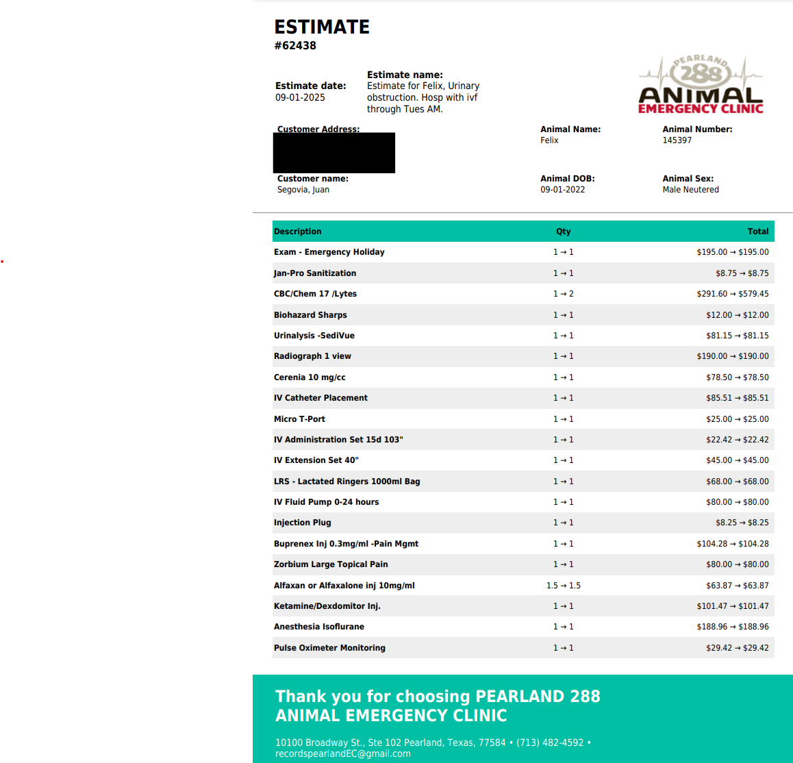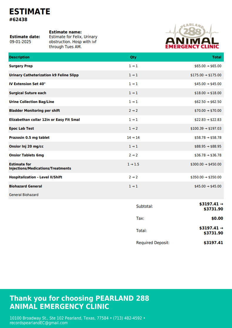 We got there around 9, and didn't leave until around 11. They confirmed what I thought he had. A urinary blockage. Sadly, the estimate I was given was 3198 up to 3900$ just for the night. Tomorrow I have to pick him up, and take him to a local vet at 7AM. Where they will need to keep him for 24-36 hours. I don't know how much that second visit will be. Especially when the 3198 after interest on a 24 month plan on care credit came out to essentially 4000$ after interest. (Care Credit email states 17.90% apr and fixed monthly payments required for 24 months. The app won't let me see the full amount after interest.) I have attached the estimate invoice the clinic was able to provide me.